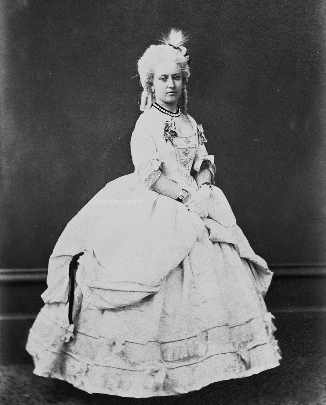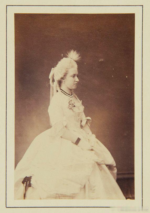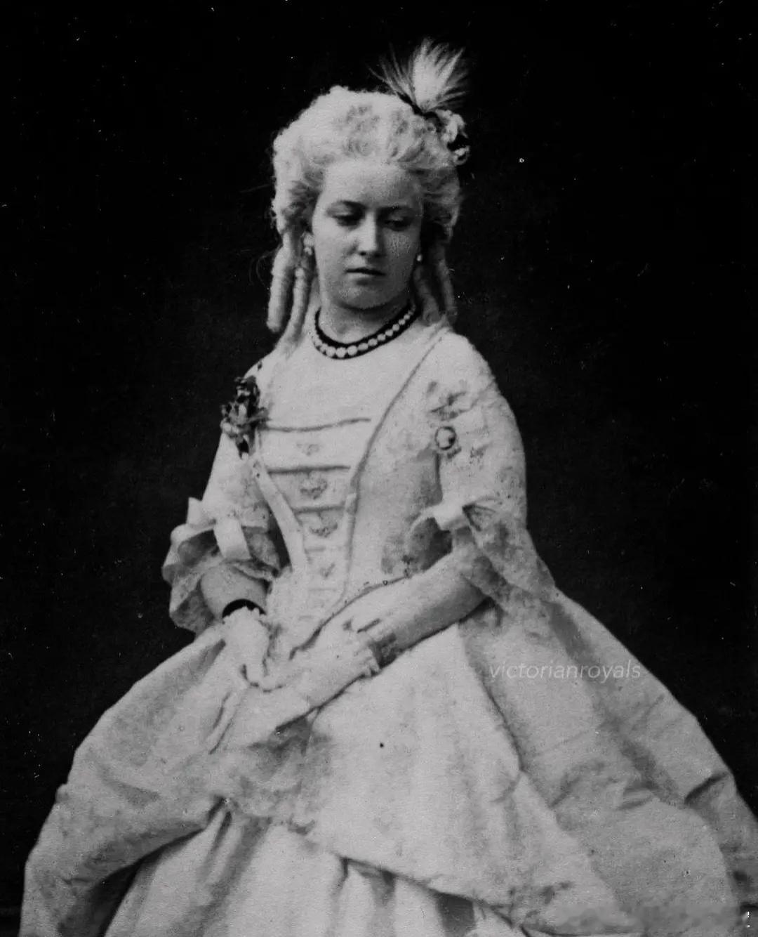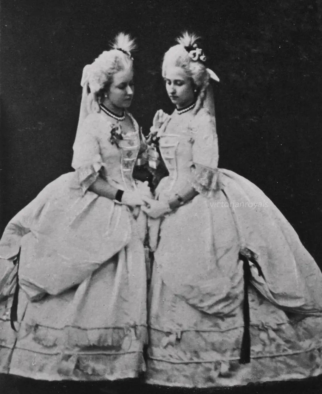 老照片 分享英国公主海伦娜和露易丝(维多利亚女王的三女和四女)身穿18世纪盛装礼服出席克莱蒙特舞会的老照片,两姐妹的颜值真的是差之毫厘,谬以千里。(图片出处见水印)
