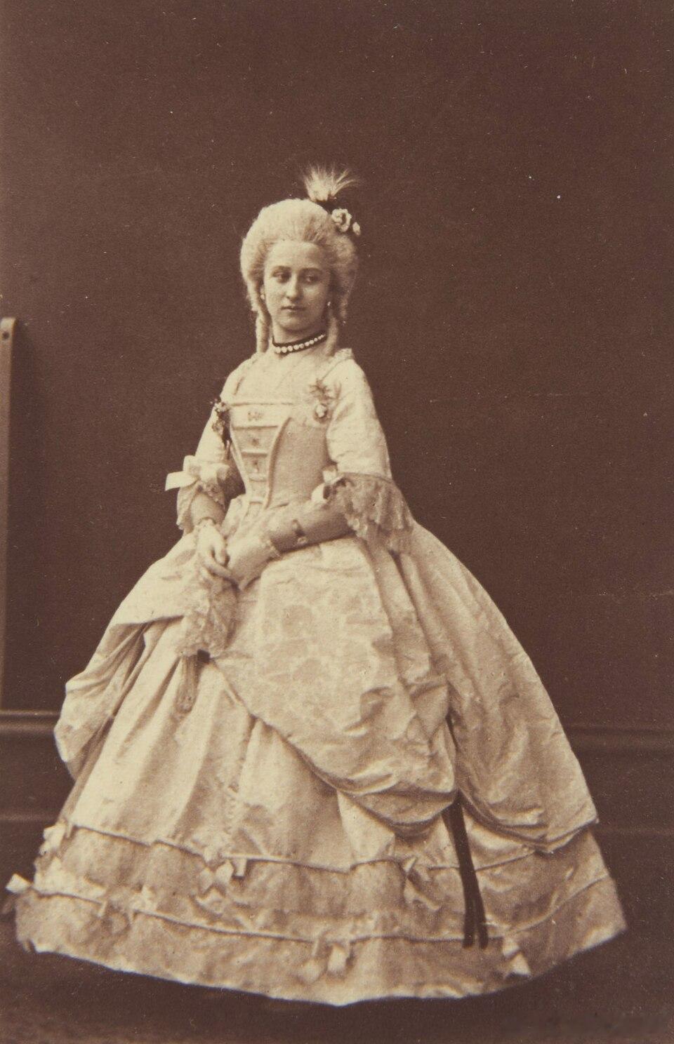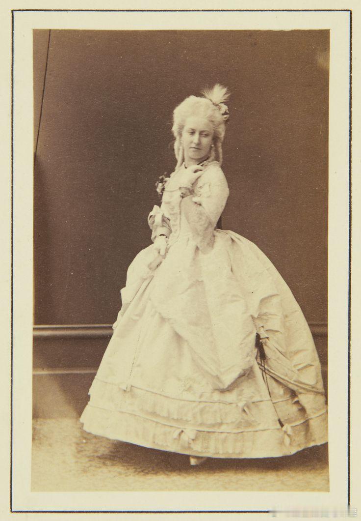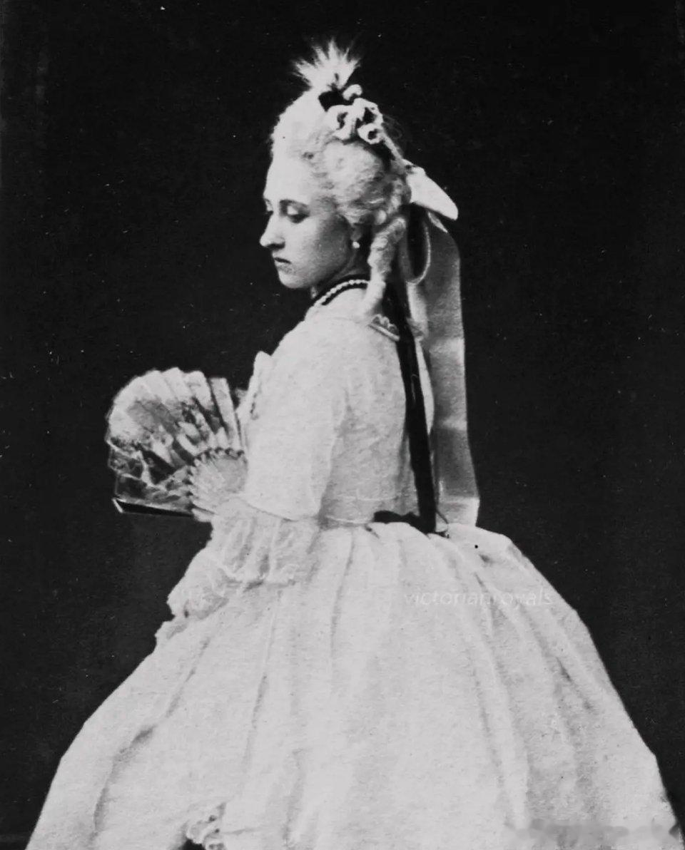 老照片 分享英国公主海伦娜和露易丝(维多利亚女王的三女和四女)身穿18世纪盛装礼服出席克莱蒙特舞会的老照片,两姐妹的颜值真的是差之毫厘,谬以千里。(图片出处见水印)