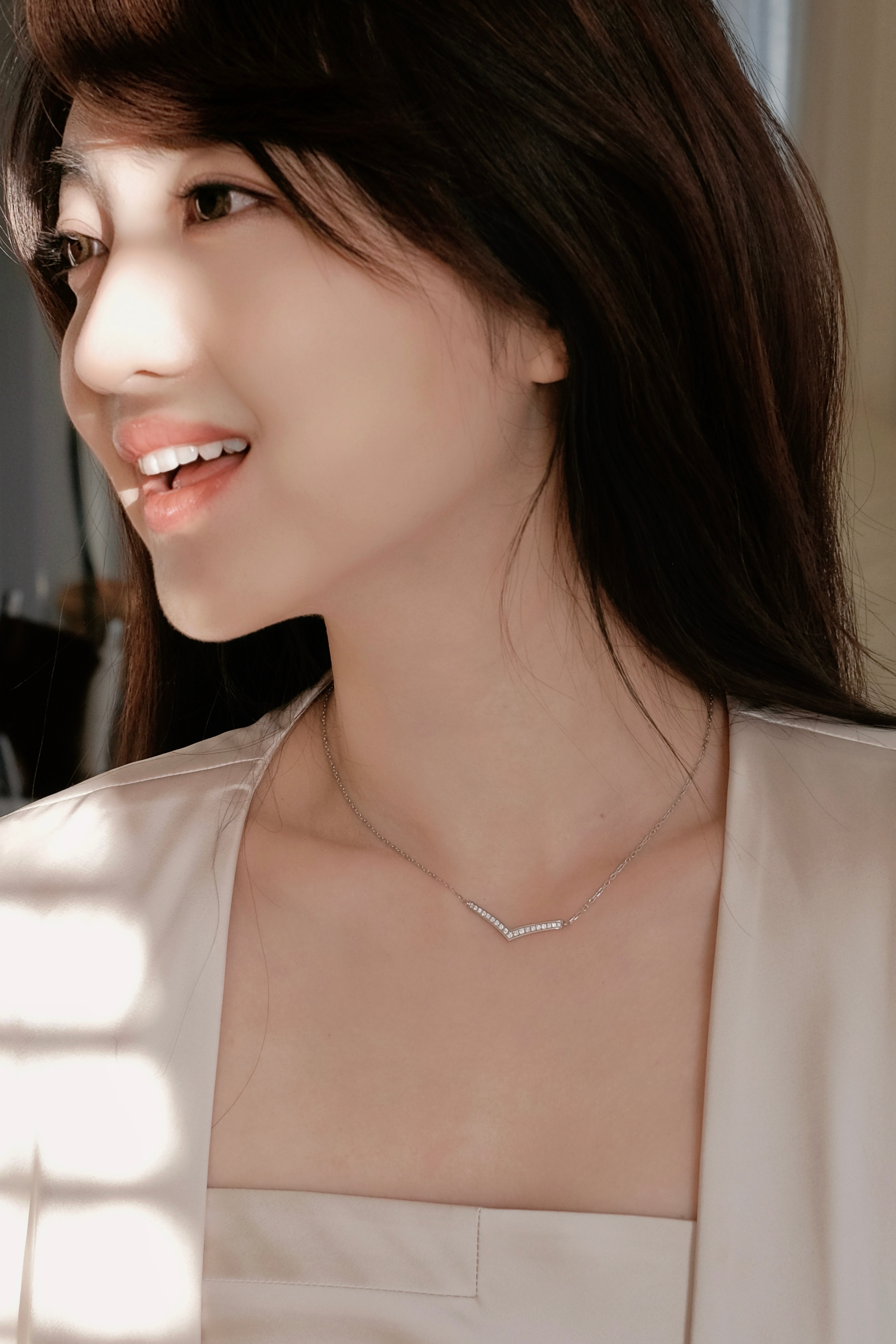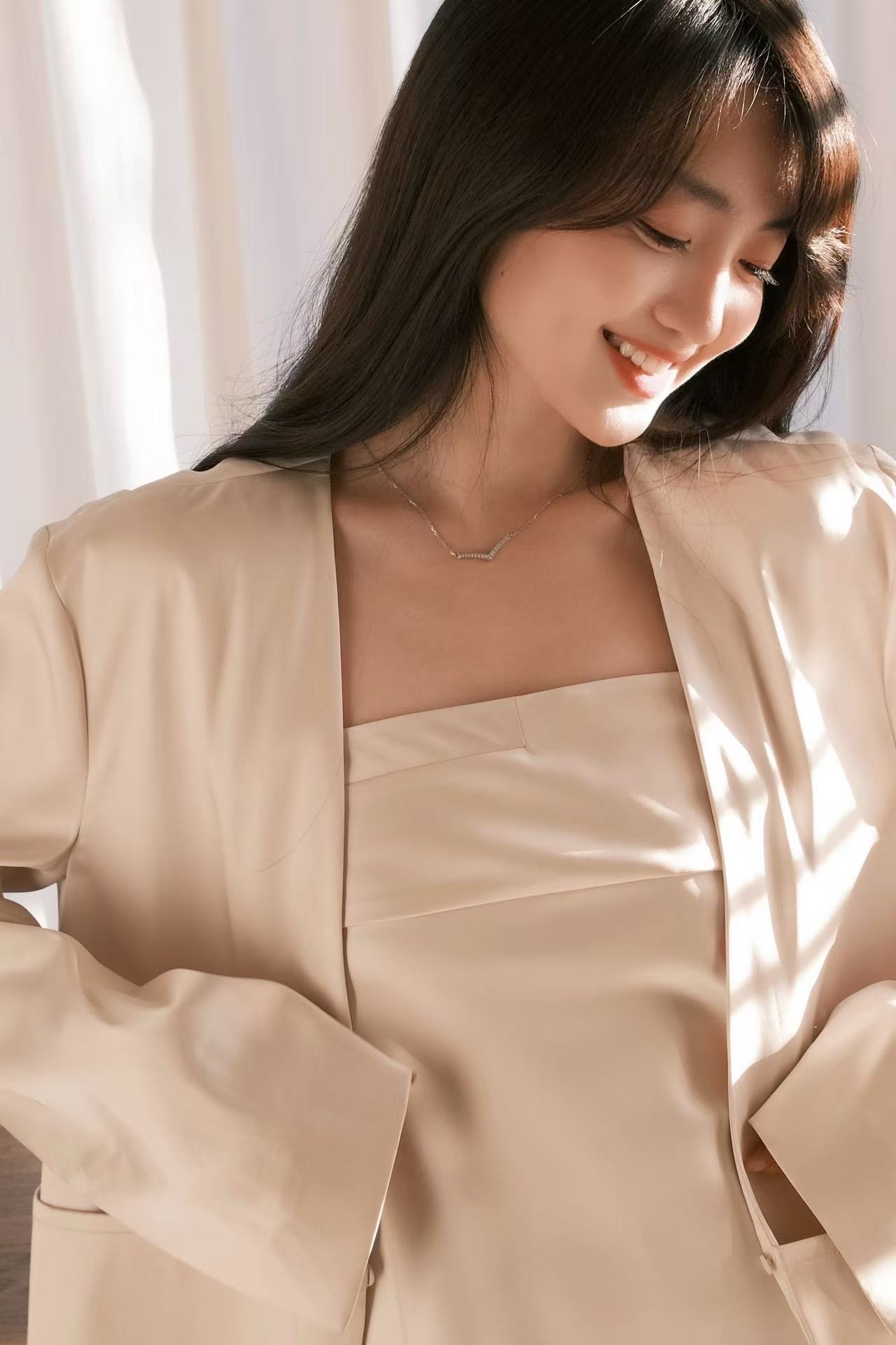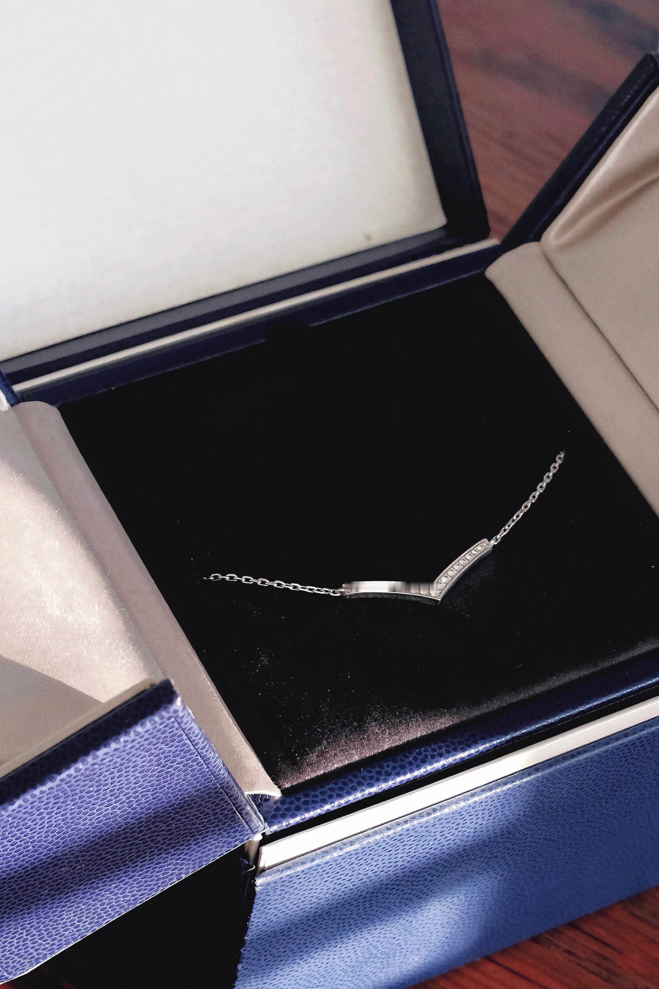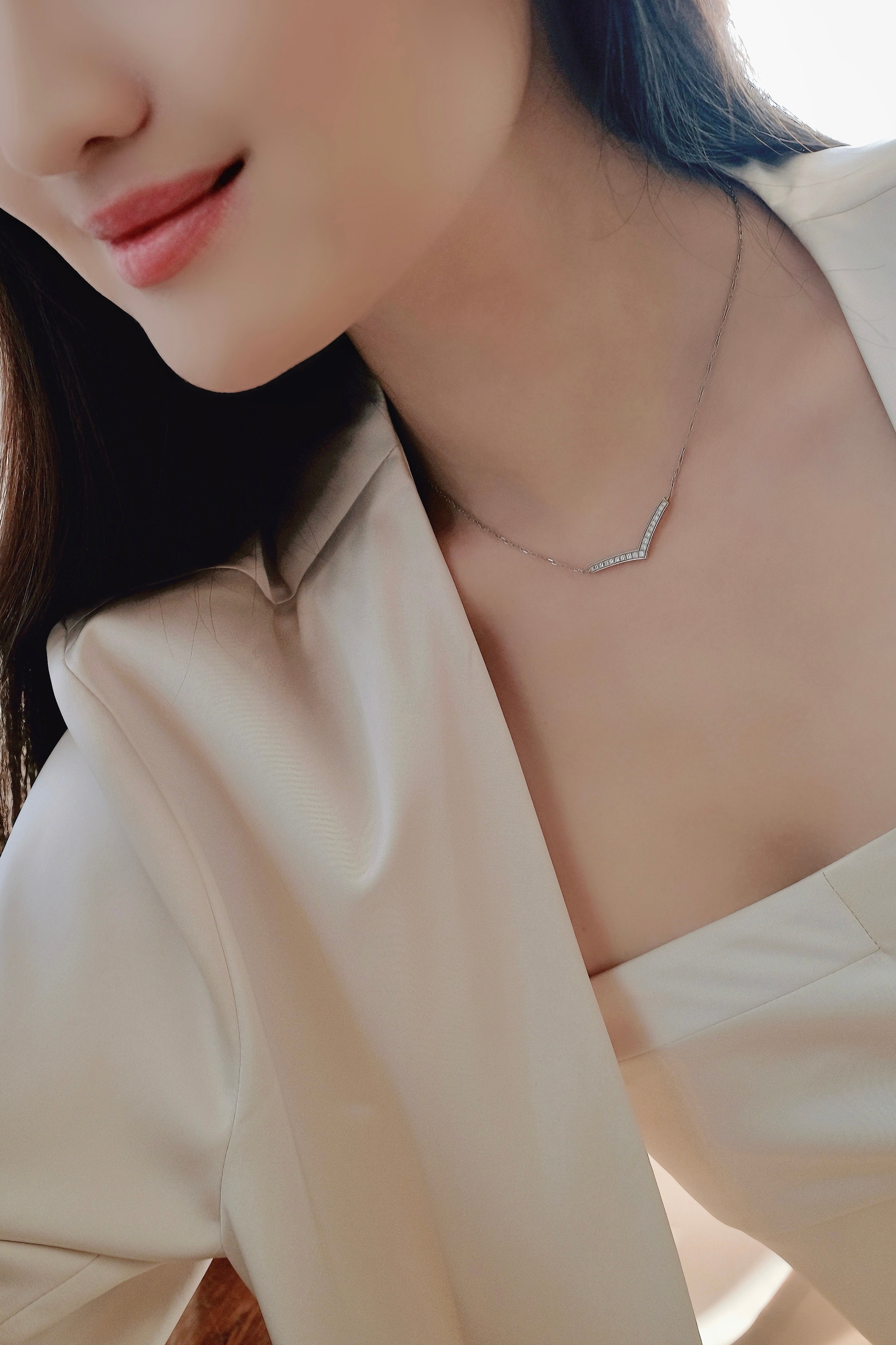 又是一年情人节,拿出他送我的天然钻石项链做搭配,V型的线条在颈间闪着温柔的光。天