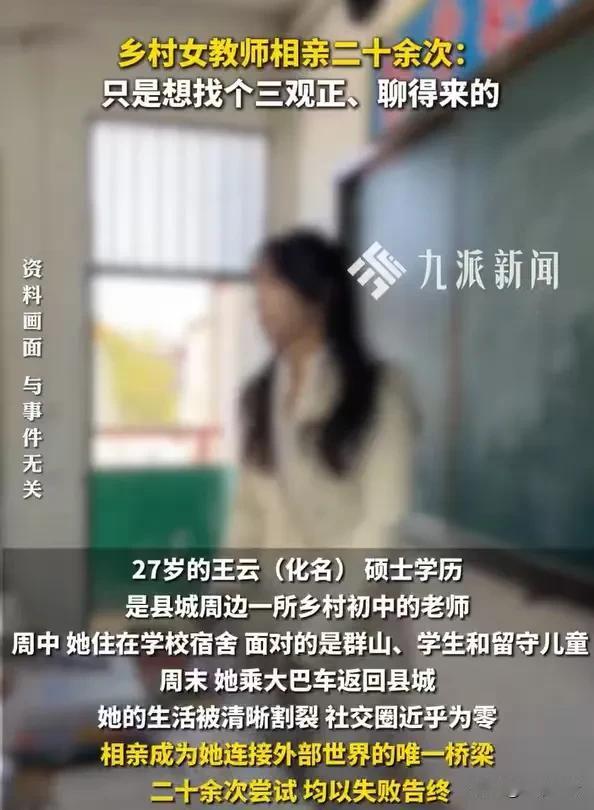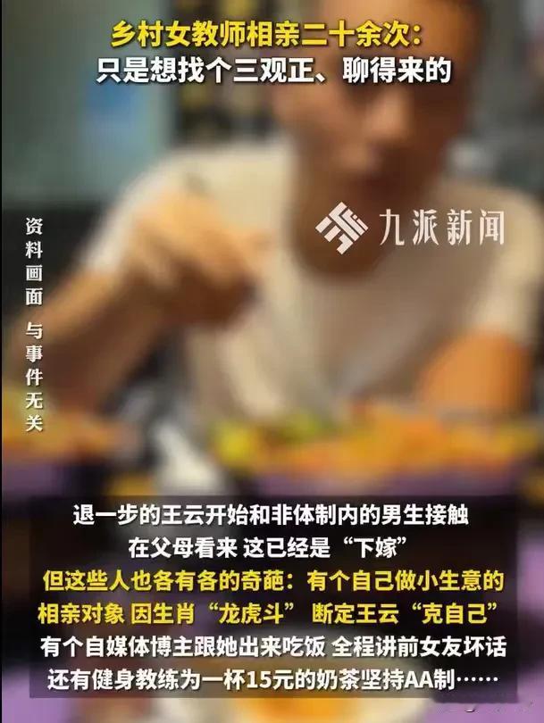 “找个三观正,聊得来的,太难了!”27岁乡村女教师,硕士毕业,在乡村初中教学,社交圈几乎为零,她相亲了20次都没有成功,一开始她看重的是编制内的男子,但他们嫌她是乡村女教师,嫌她没时间带孩子,她只能找编制外的男子,可这些人不是小气,就是人品有问题,女教师终于低头,面对现实了。 王云看着母亲,低头唉声叹气,她无奈地说道:“你都27岁了,怎么还没有男朋友,我这身体也不好,能盼着你成家,我走得也安心了。” 母亲经常这样唉声叹气地说着,父亲也经常说:“女孩子读那么多书干什么,还不是要结婚生子,现在连个对象都没有,什么时候能嫁出去!” 看着父母天天催婚,王云终于意识到,自己到了结婚生子的年龄了。 可她的工作,面对的是群山,面对的是学生,还有村里的老人和留守儿童,乡村里,适龄的男青年都已经外出工作了,同事也没有同龄的,她要找一个聊得来的同龄人,实在太难了。 她要结婚,她要找一个聊得来,三观正的同龄人,条件还要相当,她把目光投向体制内的单身男子。 在她看来,她作为一位老师,工作稳定,她也有学历,算是一名优质单身女子,她想找一个门当户对的体制内的单身男子,这想法也不为过。 她开始和这些男子相亲,她以为,以自己的条件,相亲几个,只要相貌上看得过去,能聊得来,价值观差不多,就可以了,她的要求不高。 可她没想到,她没啥要求,别人倒是要求她来了,一个国企男生和她见面,王云挺满意的,虽然只是国企,但工作也算稳定,她想和这个男生好好聊下去,不料才10分钟,这个男生就摊牌了,他说:“如果你三年内没有调回县城教书,我们没必要谈下去。” 王云愣住了,她的工作,她一直引以为傲,一份教书育人的工作,多少得到他人的尊重,在这个男生看来,却成了在一起的阻碍,王云给不了他一个肯定的回答的,谁知道什么时候能调回县城,她在乡村工作,本身也不差,却被如此要求。 她看着男生,就算男生想和她谈下去,她都没有心思和这个男生谈下去了,男生要求太高了。 接下来她又和一个医生相亲,医生这个职业,她向来很敬佩,这工作更稳定,救死扶伤,更得到别人的尊重,她觉得医生这个职业,会成就医生的品行,三观一定很正。 她对医生没有什么要求的,倒是想和他谈下去,结果医生的母亲鸡蛋里挑骨头了,她说:“一个乡村教师,以后带孩子都没有时间,更别说照顾孩子了。” 王云一听,终于意识到,这些体制内的男生,他们对女生要求很高,他们不但要求女生学历高,有工作,甚至还要求女生能够带孩子,照顾孩子,他们要的,可能是一个高素质,有收入的保姆。 王云放弃了找体制内的男生了,她转向找体制外的男生,觉得灵活就业的男生,他们的见识更广。 然而,当她和这些男生相亲之后,发现这些男生也是各有各的缺点。 就说一个做小生意的男生吧,他不过是做一个小生意,要求还挺高的,仅仅因为生肖龙虎斗,就怕王云克他,第一时间就否定了王云。 王云遇到这样的男生,被这样否定,她倒也不再放在心上,她又相亲了一个自媒体的男子,结果这个男子全程在讲前女友的坏话,这素质,王云不敢恭维。 更有小气的,一个健身教练,为了一杯15元的奶茶,还要和她AA制,这么小气的男生,王云更是看不上了。 王云相亲了20次,其实每一次相亲,她都没有提什么要求,只想着在聊天的过程中,只要感到对方三观正,双方能够相谈甚欢,这就足够了。 一开始她是想找体制内的,但后面已经降低了要求,体制外的也能接受,可即使如此,想找一个人品可以,还能聊得来的男生,实在太难了。 现在她看着父母为了她的终身大事,整天唉声叹气,她知道如果自己还不尽快解决自己的人生大事,父母,亲戚,朋友,都会对她另眼相看。 其实王云才27岁,想结婚也可以,不想结婚也行,她的婚姻她做主,任何人都不能干涉。 《民法典》第1046条规定:结婚应当男女双方完全自愿,禁止任何一方对另一方加以强迫,禁止任何组织或者个人加以干涉。 因为他人的干涉,所以王云降低自己的要求,只想完成自己结婚这个任务,这是对自己不负责的。 那么你对王云的择偶要求有何看法呢?(王云为化名)
