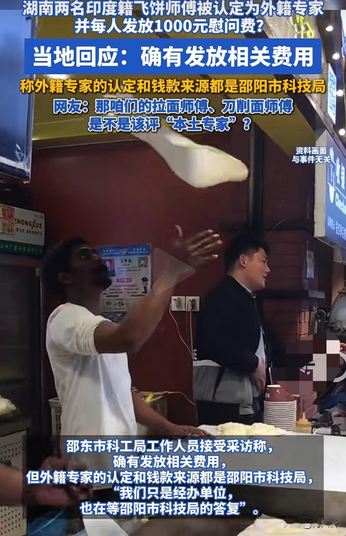 两名印度籍飞饼师傅认定为外籍专家,还每人发1000元慰问费,那咱的拉面师傅、刀削面师傅是不是也能评“本土专家”了。一份飞饼卖20多还挺受欢迎。工作人员称等官方通报。按湖南申请外国专家工作许可证条件,专家得符合不少要求。这飞饼师傅到底算不算专家