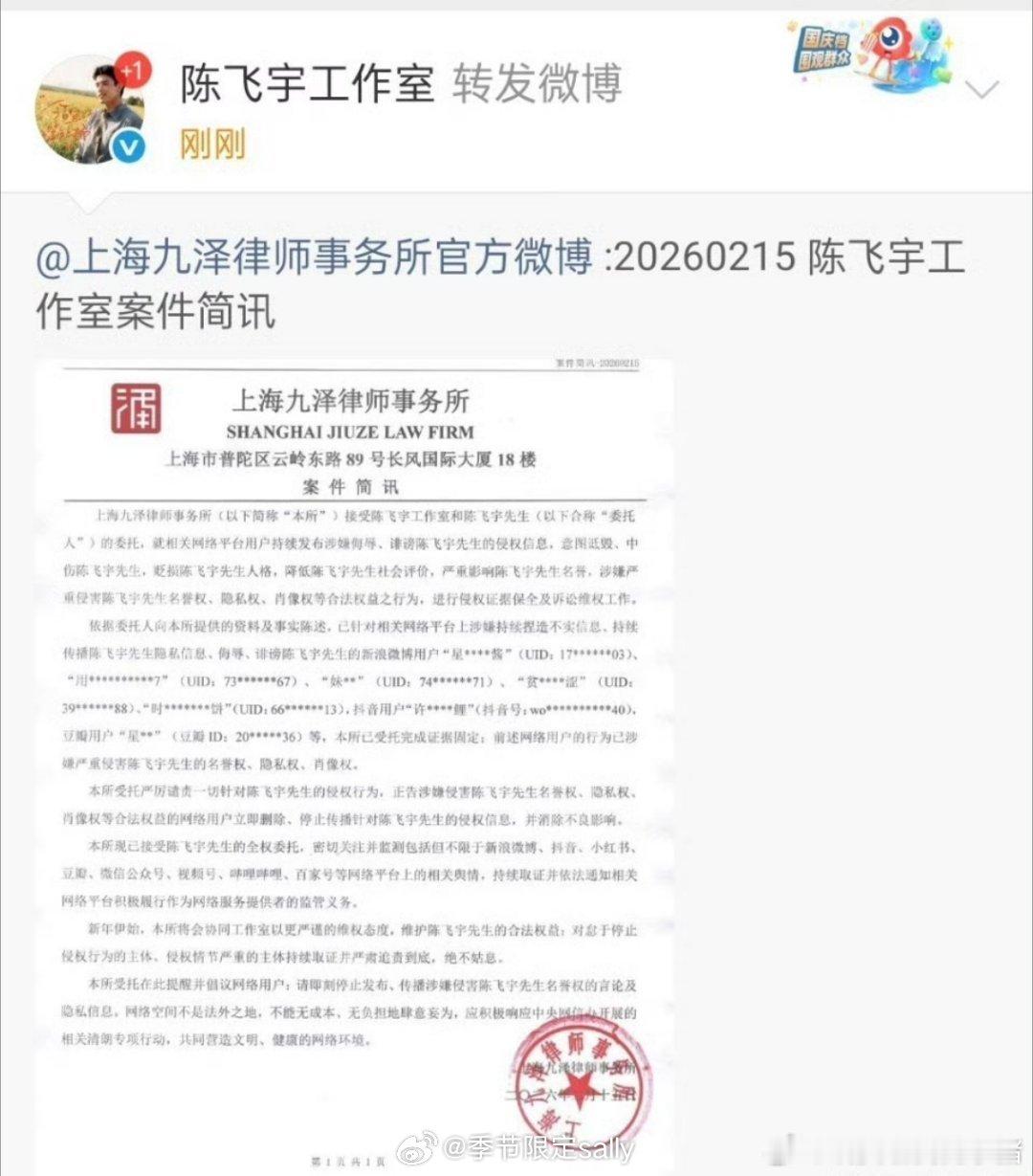 陈飞宇方告黑维权