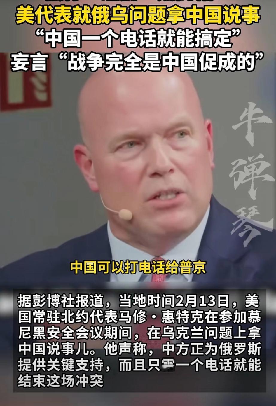 绕着绕着就把中国绕进去了…… 2月13日,美国北约代表马修认为: 是中国促成了俄乌战争,是中国向俄罗斯提供“双重技术”让俄罗斯得以维持战争。 如果中国不买俄罗斯天然气和石油,“打一个电话俄罗斯就会停战”。 事实上,美俄乌天天谈判还是解决不了问题,于是绕着绕着就把中国绕进去了……