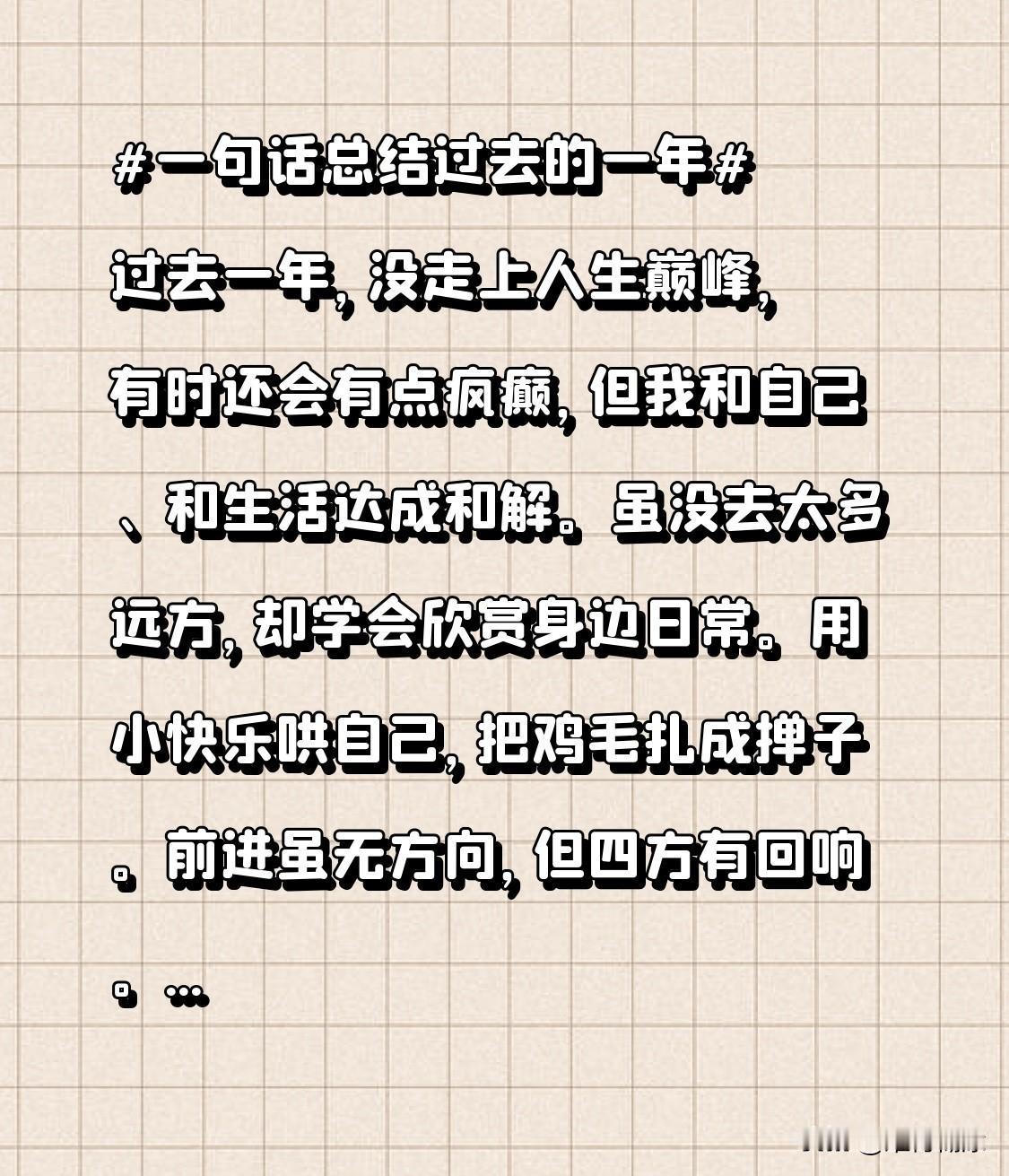 过去一年,没走上人生巅峰,有时还会有点疯癫,但我和自己、和生活达成和解。虽没去太多远方,却学会欣赏身边日常。用小快乐哄自己,把鸡毛扎成掸子。前进虽无方向,但四方有回响。这一年没被打倒就是胜利,新一年,我会更好!