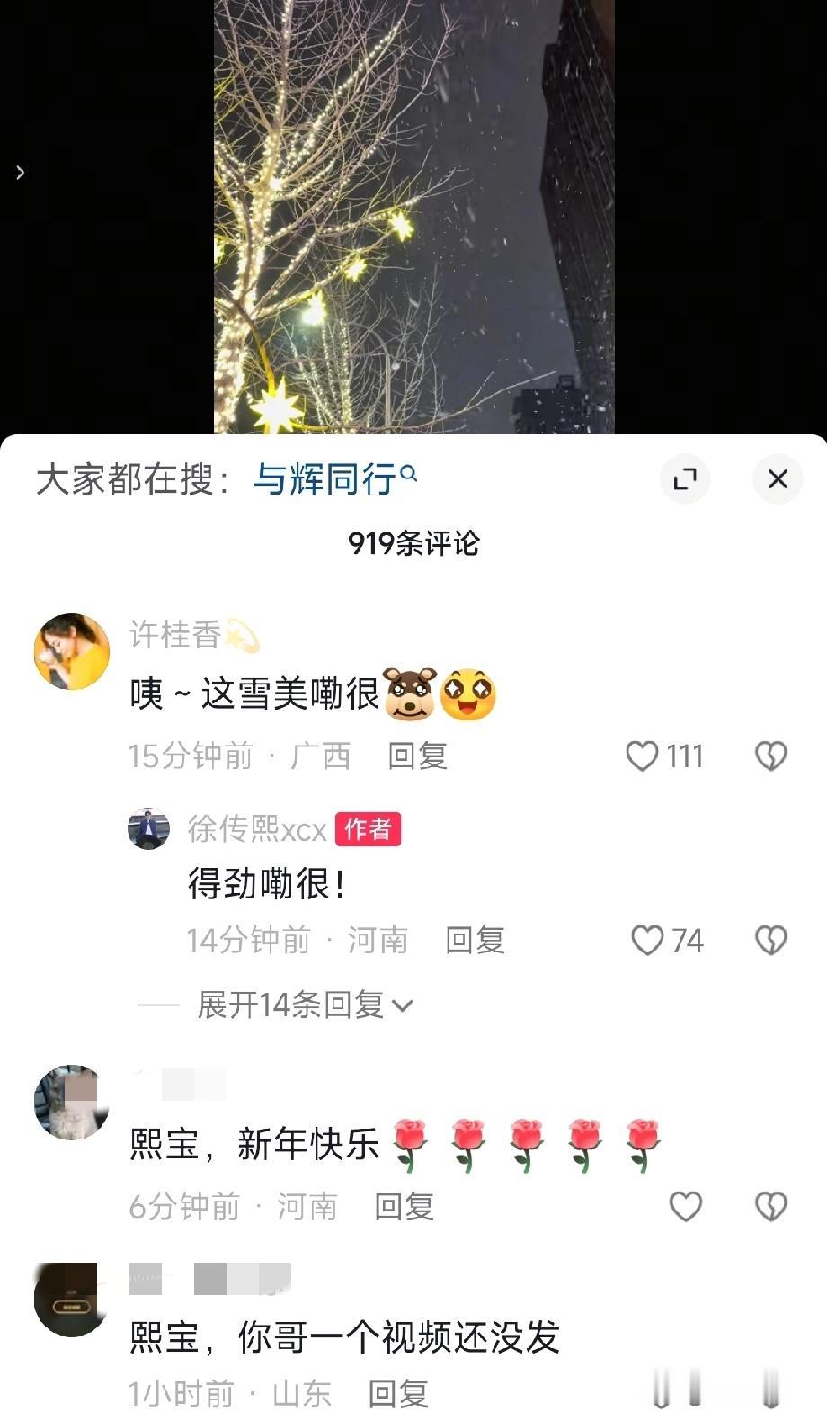 哈哈,传熙终于更新视频啦!虽然视频很短。自从2月10日凌晨传熙下播后更新的一个视频,这几天一直都没出现过。 我们看到了董董在家带娃,潇潇在家品尝着家乡美食,鹏鹏在家体验制作家乡美食,安安在家陪妈妈逛街,小贝在旅游,汉森也带着他的狗狗回老家了。到目前为止,就没看到两位陕西的朋友更新视频了。不过,盼盼和同事们互动的倒是很急积极的,也算是不见其人但闻其声吧。 再过几十分钟就除夕啦,祝大家新年快乐! 董宇辉 与辉同行 兰知春序