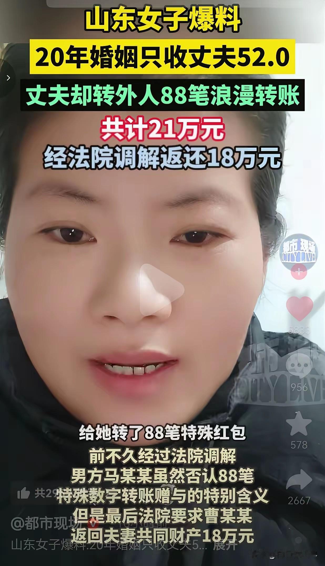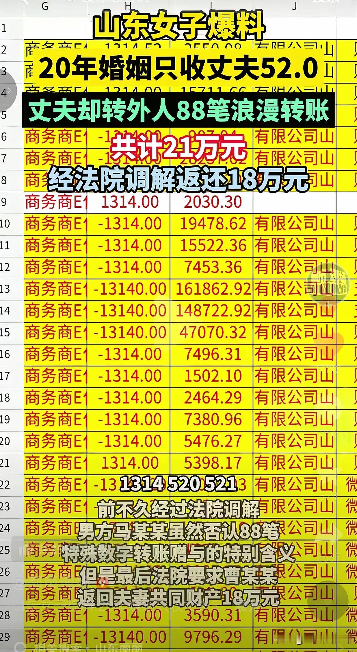 这哪是过日子,这是守活寡啊!根据2月14日的报道,山东一女子丽丽,在情人节这天把自己的婚姻扒得明明白白,也把无数网友看破防了。 她和丈夫结婚20年,收到的转账只有两笔:一笔52块,另一笔是131.4块。 这哪是过日子,这是守活寡啊!2026年2月14日情人节当天,山东滕州女子丽丽把自己20年的婚姻摊开在众人面前,一段冰冷的转账记录,瞬间看破防了无数网友。 丽丽与丈夫携手走过二十个春秋,从青涩年少走到中年安稳,她把整个青春都交付给了家庭,日复一日操持家务、照料老人、抚育子女,把琐碎的日子扛在肩上,却没等来应有的珍惜与温情。 二十年间,丽丽在这段婚姻里收到的转账仅有两笔,一笔是52元,另一笔是131.4元,加起来不过183.4元,这是丈夫二十年来用数字表达的全部心意。 对比之下,更让人心寒的事实浮出水面,近四年时间里,丈夫向婚外第三方转账多达88笔,金额全是520、1314这类饱含特殊寓意的数字,累计总额高达21万元, 情人节、纪念日、生日,每一个值得纪念的日子,丈夫的浪漫与慷慨都给了外人,留给结发妻子的只有敷衍与冷漠。 丽丽平日里省吃俭用,舍不得为自己添置新衣,舍不得花钱享受生活,所有开销都以家庭为先,把最好的都留给家人与孩子,她以为平淡的坚守能换来安稳的相伴,却没想到自己的付出在丈夫眼里如此廉价。 二十年来,她守着没有温度的婚姻,过着形同虚设的夫妻生活,承担着家庭的全部责任,却得不到丝毫情感与物质上的回馈,活成了家庭里最孤独的付出者。 更让人窒息的是,从2020年开始,丈夫先后八次向法院提起离婚诉讼,急于摆脱这段婚姻,一边迫切切割关系,一边大肆挥霍夫妻共同财产讨好外人,双重的伤害让丽丽彻底心寒。 她没有选择隐忍,而是拿起法律武器维护自身权益,将第三方起诉至法院,要求返还被擅自处分的夫妻共同财产。 法院在审理后,结合双方提交的证据与案件事实,最终调解由第三方返还18万元,用法律的公正守护了丽丽的合法权益。 这场发生在情人节的婚姻真相,没有狗血的剧情,只有最真实的残酷,二十载朝夕相伴,抵不过几十笔转账的温情,一个女人最好的年华,在冰冷的婚姻里慢慢消耗。 丽丽的经历被分享到网络后,迅速引发全网热议,无数网友为她的遭遇感到心疼,也为她的勇敢维权点赞,一段本该相互扶持的婚姻,最终只剩下心寒与对峙,也让更多人看清了婚姻里忠诚与尊重的重要性。 对此,你们有什么看法,欢迎评论留言~