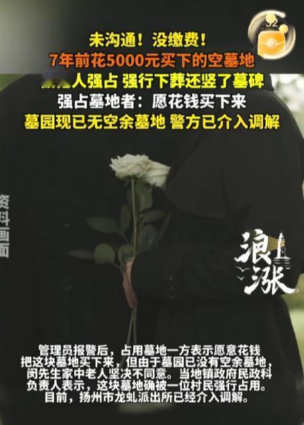 这是明抢啊!江苏扬州,80岁老人7年前精心挑选了一块墓地,儿女们为了让老人宽心,花5000元买了下来。谁知,不久前家人竟发现,原本空着的墓地竟被人占用,还光明正大竖起了墓碑。一家人震惊不已,找到墓园管理方讨要说法,工作人员称:确实被当地村民强行占用了,他们拦都拦不住。对此,占用者嚣张表示:我愿意花钱买下来!这让老人万万无法接受。 几年前这个墓园刚开发出售,两位八旬老人身体还算硬朗,就是心思细,想着提前把身后事安排妥当,既不给儿女添麻烦,自己心里也踏实。 那段时间,老人特意让儿女陪着,一趟又一趟往墓园跑,比对了一块又一块地方,终于挑中了一块合心意的墓地,位置、朝向都让老人十分满意,觉得自己百年之后,能在这里安安稳稳安息,就是最大的心愿。 儿女们看着老人高兴,也想着让老人彻底宽心,没多犹豫,就花5000块钱把这块墓地买了下来,手续办得妥妥当当,就等着以后派上用场。 从那以后,老人时不时就会让亲属陪着去墓园看看,看着那块属于自己的空地,心里就格外踏实,有时候还会跟儿女念叨,说自己没白挑,以后在这里,也能看着家里人。 这七年里,那块墓地就一直安安静静空着,闵先生一家也没多想,毕竟是花钱合法买下来的,墓园有管理方看着,怎么也不会出什么差错。可他们万万没料到,就是这份理所当然的放心,最后竟变成了满心的气愤和无奈,更让人窝火的是,墓园管理方的说法,让他们觉得格外荒谬。 发现墓地被占后,闵先生(化名)第一时间就联系了亲属,让亲属先去墓园问问情况,可亲属跑了一趟,什么结果都没拿到,问题压根没人管。 没办法,闵先生夫妻俩只好亲自赶去墓园,找到管理方的工作人员讨要说法,想知道到底是谁,敢这么大胆,占用别人合法购买的墓地。 面对闵先生一家的质问,工作人员也没隐瞒,只是语气里满是无奈,说他们早就知道这事,甚至在对方下葬的时候,还极力阻拦过。 工作人员说,占用墓地的是当地的一位村民,对方下葬的时候,既没有提前跟墓园沟通,也没有缴纳任何费用,就是带着人硬来的。 当时墓园的管理员王师傅,还有其他几位工作人员,都赶过去拦着,双方僵持不下,差点就发生了肢体冲突,可不管他们怎么拦、怎么说,那位村民就是不听劝,态度十分强硬,硬是带着人把逝者葬进了这块墓地,还随后竖起了墓碑。 拦不住之后,工作人员第一时间就把这事反映给了当地的民政部门,还报了警,可即便如此,事情还是没能及时解决,那块墓地,就这么一直被对方占着。 闵先生一家听完这话,心里更气了,墓园明明是有管理责任的,收着管理费用,却连已经出售的墓地都看不住,任由外人强行占用,这让花钱买墓地的人,怎么能安心。 更让他们无法接受的是,警方介入之后,那位占用墓地的村民终于有了回应,可回应的话,却透着一股肆无忌惮的嚣张。 对方没有丝毫歉意,也没有提出要迁走逝者,反而直言,自己愿意花钱,把这块墓地买下来,仿佛只要他愿意出钱,就能随意抢占别人已经合法拥有的东西,仿佛这七年里,老人的精心挑选、儿女们的孝心付出,还有那5000块钱的购房款,都一文不值。 闵先生的夫人说,他们确实接到过调解电话,墓园方面也希望双方能调解解决,可他们根本无法答应。因为松鹤墓园现在已经没有空余的墓地了,要是同意对方花钱购买,两位老人就再也找不到合心意的安息之地,这是老人万万不能接受的,也是一家人无法妥协的。 两位八旬老人,七年前花心思挑选,儿女们花 money 买下,图的就是一个落叶归根,就是一个身后安宁,可现在,这份安宁被人硬生生打破,甚至被人用“花钱购买”的说法,轻描淡写地践踏。 随后,闵先生一家又找到了龙虬镇政府的民政科,想寻求政府部门的帮助,民政科的负责人也明确表示,这块墓地确实是被当地村民强行占用的,目前,扬州市龙虬派出所已经正式介入调解,后续他们也会全力配合闵先生一家,跟占用者沟通协商,争取尽快把事情解决好,还老人一个公道。 很多人可能不知道,合法购买并取得手续的墓地,使用权是受法律保护的,他人强行占用,本身就是侵权行为,而墓园作为管理方,没能尽到管理责任,也需要承担相应的责任。 两位八旬老人,本来安安稳稳等着百年之后能有一个清净的安息之地,却没料到遭遇这样的事,好好的心愿,被人硬生生打乱,换做是谁,都无法接受。 目前,事情还在进一步调解中,不知道最终能不能得到一个让老人满意的结果,不知道那位强行占用墓地的村民,能不能认识到自己的错误,主动迁走逝者,还给老人一个公道。 这事传到网上之后,也引发了不少人的关注,有人觉得这就是明抢,花钱买的东西,凭什么被别人强行占用,也有人觉得墓园管理失职,应该承担主要责任。 那么大家觉得,这位村民的做法合理吗?墓园的管理方,真的没有责任吗?老人最终能拿回属于自己的墓地吗?欢迎在评论区留下你的看法。