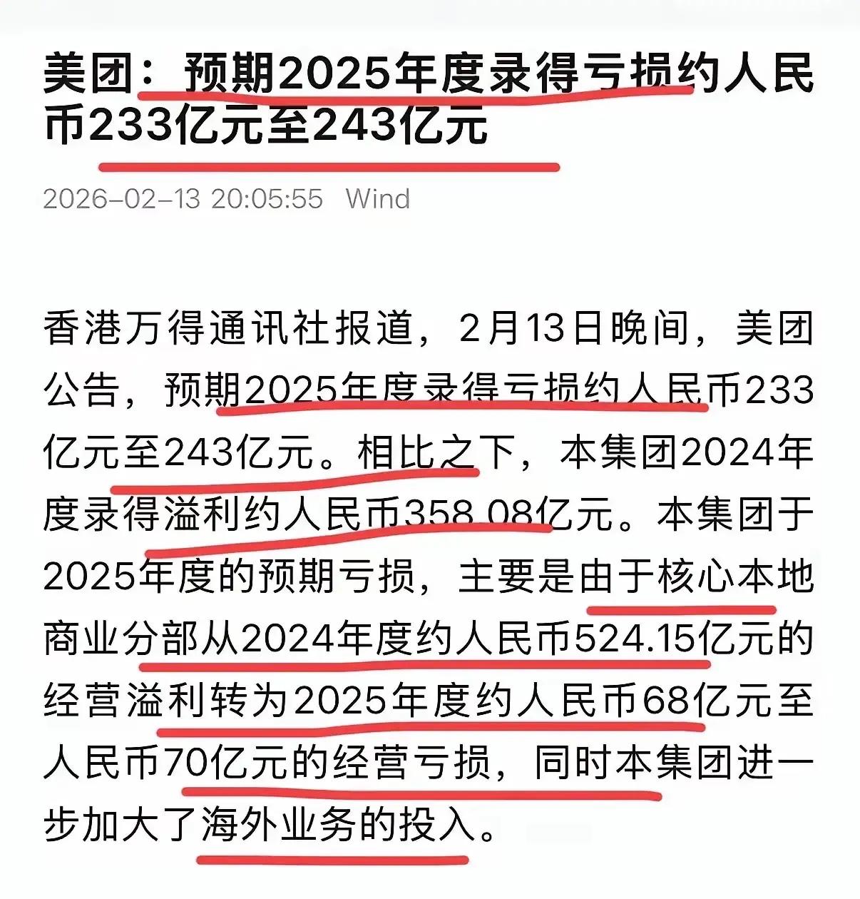 淘宝闪购是阿里近年最漂亮的一次反击战! 令某团万万没想到是,常年被压制的对手,还有咸鱼翻身的一天?但,阿里的太子蒋凡做到了,他一上任,令人非常意外的是,不是向对手拼夕夕发动进攻,而是大刀砍向了某团!!王总当年大赞这两个最聪明的年轻人,认为蒋凡打赢对拼夕夕的一战就能成为阿里当之无愧的新接班人,新领袖~ 不过,令王总万万没想到的是,这个最聪明的年轻人一上台,就向他发起了进攻,给了他当头一棒~ 现在的淘宝闪购,加上搅局的京东,让某团市场份额尽失,大幅亏损,2024还盈利358亿,而去年亏了243亿,就问你吓不吓人? 某团只能跑去搞海外市场谋取一些新的增长点?问题是国内打不过,靠国外能行吗?这是一个问题!! 问题该还大着呢? 阿里高层和马老师对这次战役非常满意,鼓励团队大胆去做,不要担心亏损,有钱! 2026,会继续大力度投入,肯定超过2025的投入力度,谁说外卖大战要结束了,这不才刚刚开始嘛,接下来,某团和王总要如何应对呢? 我还有一个问题,百思不得其解,为何一家平台企业,动不动一年能亏上几百亿,怎么做到的,钱又去了哪里? 有大神出来科普一下么??
