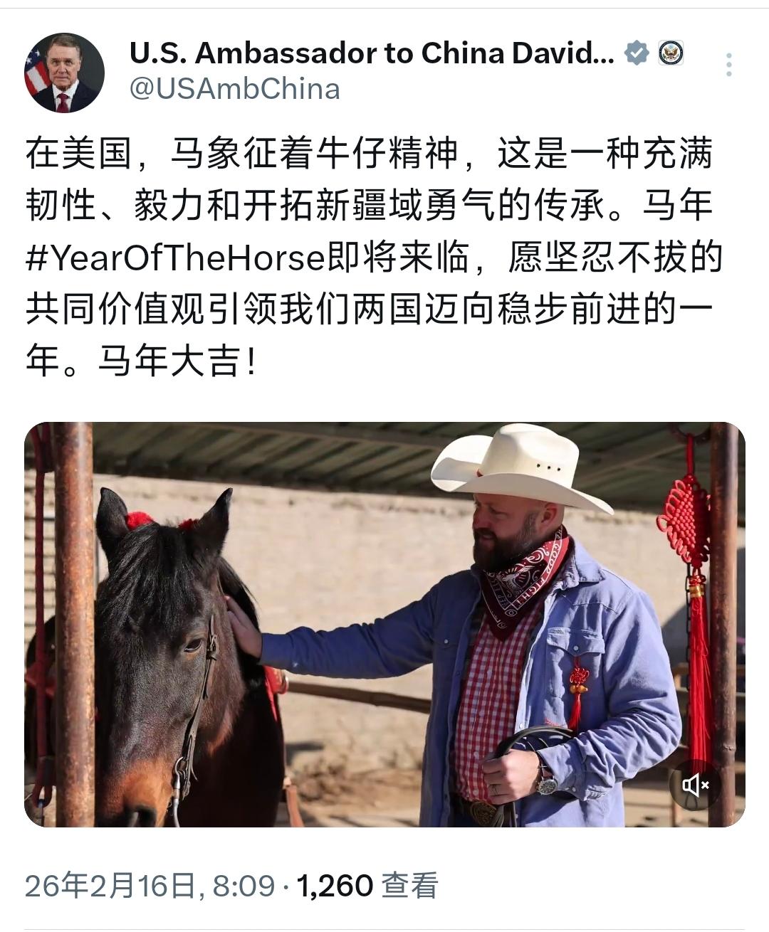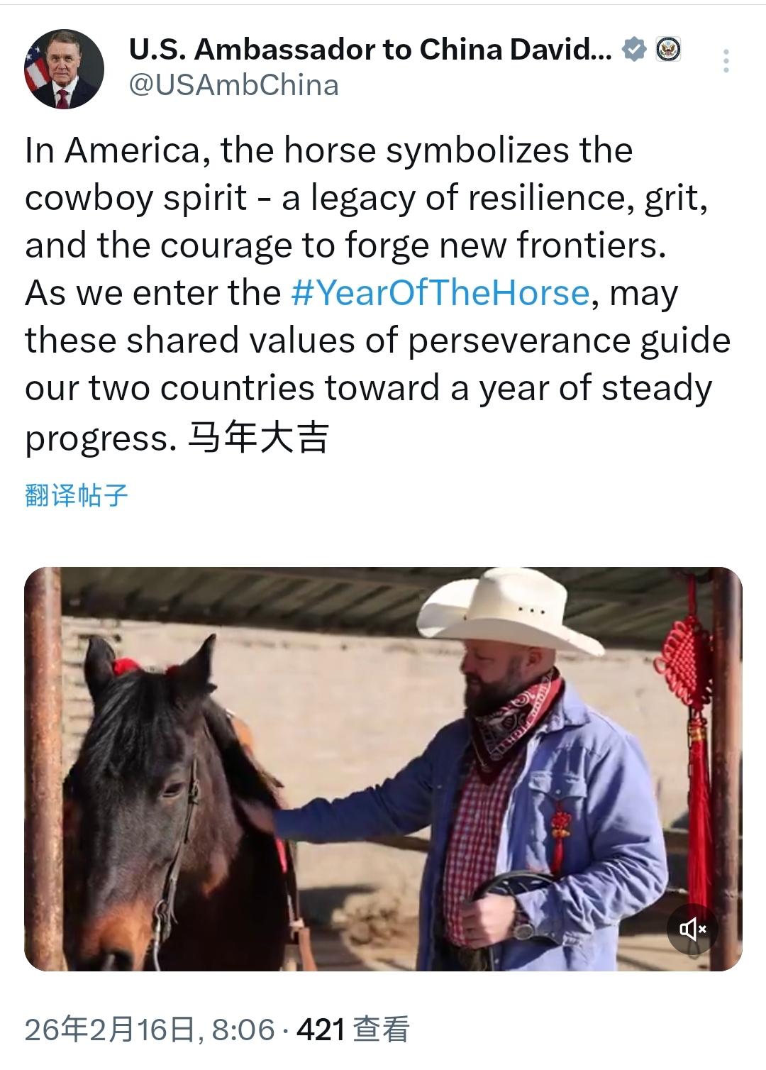 美国驻华大使庞德伟今天(2月16日)用中英文双语写道:“在美国,马象征着牛仔精神,这是一种充满韧性、毅力和开拓新疆域勇气的传承。马年YearOfTheHorse即将来临,愿坚忍不拔的共同价值观引领我们两国迈向稳步前进的一年。马年大吉!” [机智]评几句:今天是除夕,美国驻华大使也送上吉祥话。庞德伟用中英双语送上马年祝福,还特意将美国牛仔精神与马年意象绑定,试图以此拉近中美关系、强调共同价值观,姿态看似友善温和,但外交表态终究要靠实际行动支撑。嘴上说着稳步前进,现实里经贸限制、科技壁垒、地缘博弈仍在持续。祝福再动听,也抵不过实打实的政策善意。中美关系真正需要的不是一年一次的吉祥话,而是减少对抗、尊重彼此核心利益的务实行动。唯有言行一致,所谓“共同价值观”才不会沦为空洞的外交修辞。