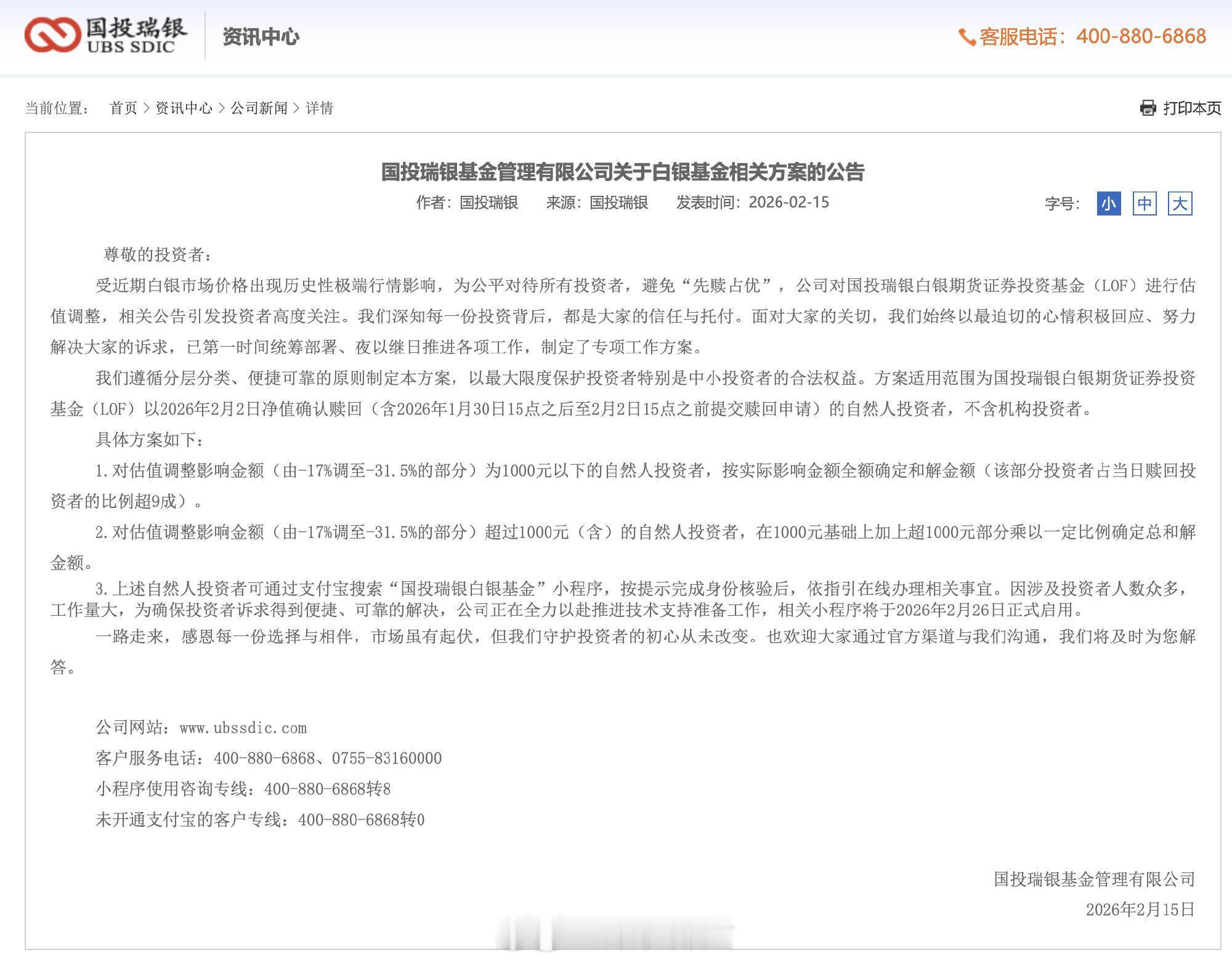 国投瑞银就白银基金估值调整事项制定专项工作方案。这是要退钱了? 国投瑞银基金制定专项工作方案