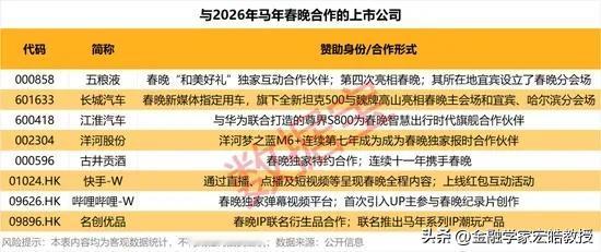 看下图,2026年春晚合作伙伴名单,变与不变间尽是时代脉络。 不变的是坚守:白酒企业与汽车品牌依旧稳站舞台,五粮液第四次登上春晚,洋河梦之蓝M6+连续7年独家报时,古井贡酒更是创下连续11年携手春晚的纪录,总有人说年轻人不爱喝白酒,但是白酒用最长情的春晚陪伴告诉大家,白酒早已把自己酿成了中国人骨子里的年味。另外,长城汽车也再度携手,彰显着消费市场的韧性底色。 变的是风向:曾经霸屏的互联网巨头悄然退场,宇树科技、追觅科技,字节豆包、火山引擎等AI与机器人企业强势登场。 从互联网红包到AI,机器人,春晚舞台的迭代,正是中国硬核科技从跟跑到领跑的生动注脚。