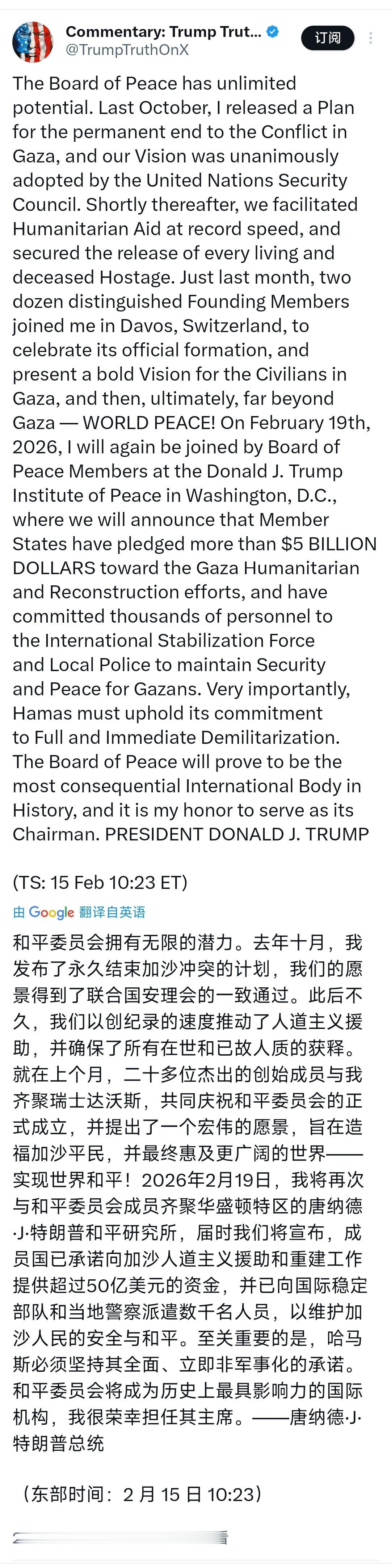 特朗普称,和平委员会将成为史上最具影响力的国际机构。 特朗普昨晚(北京时间2月15日晚)写道:“和平委员会拥有无限的潜力。去年十月,我发布了永久结束加沙冲突的计划,我们的愿景得到了联合国安理会的一致通过。此后不久,我们以创纪录的速度推动了人道主义援助,并确保了所有在世和已故人质的获释。就在上个月,二十多位杰出的创始成员与我齐聚瑞士达沃斯,共同庆祝和平委员会的正式成立,并提出了一个宏伟的愿景,旨在造福加沙平民,并最终惠及更广阔的世界实现世界和平!2026年2月19日,我将再次与和平委员会成员齐聚华盛顿特区的唐纳德·特朗普和平研究所,届时我们将宣布,成员国已承诺向加沙人道主义援助和重建工作提供超过50亿美元的资金,并已向国际稳定部队和当地警察派遣数千名人员,以维护加沙人民的安全与和平。至关重要的是,哈马斯必须坚持其全面,立即非军事化的承诺。和平委员会将成为历史上最具影响力的国际机构,我很荣幸担任其主席。” [机智]评几句:这个所谓和平委员会,根本不是为公正与和平而生,不过是特朗普绕开联合国、另起炉灶打造的私人工具,以和平之名行霸权之实,用金钱买席位、靠强权定规则,当事方被排除在外,地区意愿被彻底无视,所谓造福平民、维护和平全是骗人幌子,本质是把中东命运攥在自己手里,这样充满私利与谎言的机构,别说影响世界,只会成为国际社会的笑柄。 此外,特朗普当初喊出10亿美元永久席位费,摆明是要靠“买席位”圈钱圈人 。如今只敢吹50亿美元总承诺,却绝口不提有几个国家真掏了那10亿——至今没有一个国家公开承诺缴纳10亿美元永久席位费,连加拿大都公开拒缴并被撤邀,欧洲、中俄等主要国家要么拒绝、要么观望。所谓50亿,大概率是零散小额承诺+口头表态+企业/私人捐款凑数,跟他当初设想的“大国排队交10亿买永久席位”差了十万八千里。这组数字越吹得大,越暴露没人愿意为他的私人“和平委员会”买单,所谓“史上最具影响力”,不过是自欺欺人的独角戏。