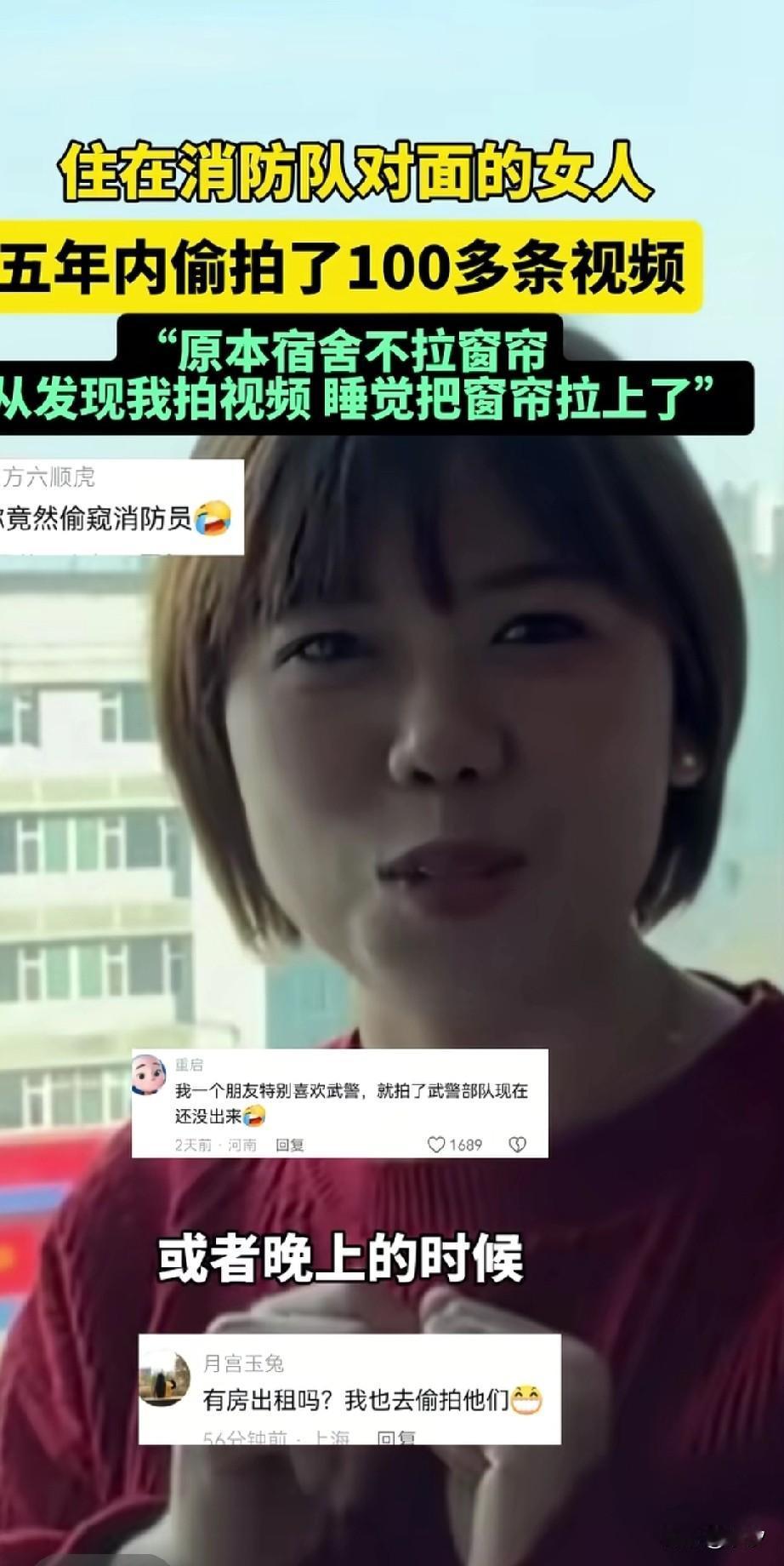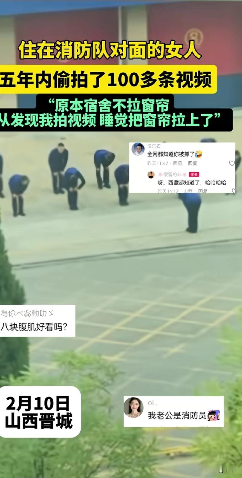 山西晋城这个女生真的太饿了, 她的房子刚好在消防队的正面, 可以坐在阳台上看到里面训练的画面, 5年内偷拍了100多条视频, 看着消防员的腹肌, 她激动坏了, 每当人家锻炼的时候, 她都坐在阳台上盯着看, 还给别人介绍这是最佳观影位, 这画面真的让人很无语, 作为女生连一点矜持都没有, 天天看有啥意思? 男人有啥好看的? 真要喜欢直接去找个消防员男朋友不好吗?非要在阳台上盯着看! 还上传了人家训练的视频, 对面是消防员的宿舍, 平时人家中午睡觉都不拉窗帘, 发现有女生偷拍之后就把窗帘都拉上了,这名女子发现后, 还发视频吐槽消防员不讲武德, 你说这让人咋说? 看来是饿久了, 有网友留言我老公是消防员, 还有网友表示8块儿腹肌好看吗? 现在的女生真的是没有一点矜持感, 看到肌肉块儿的男生哈喇子流一地, 大家对于美女偷拍消防员5年这事怎么看? 山西 消防员日常拉练 消防员锻炼