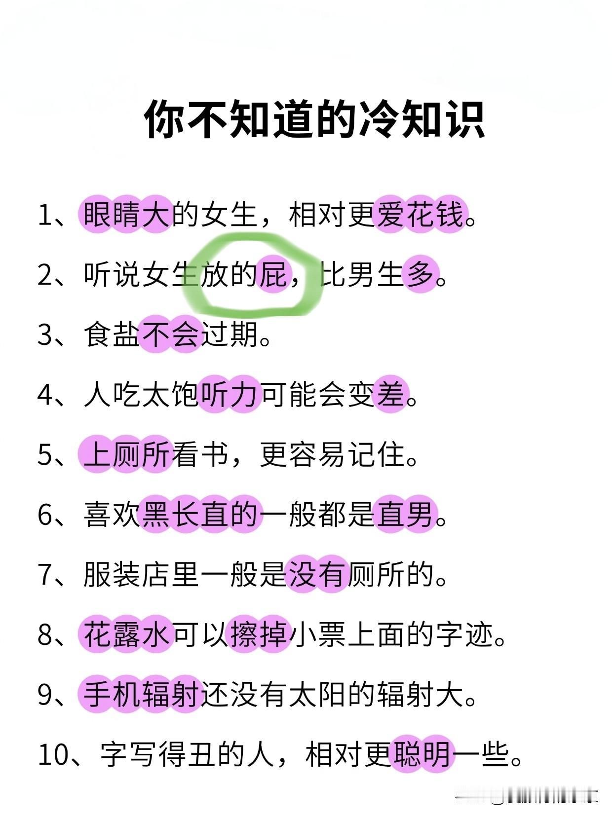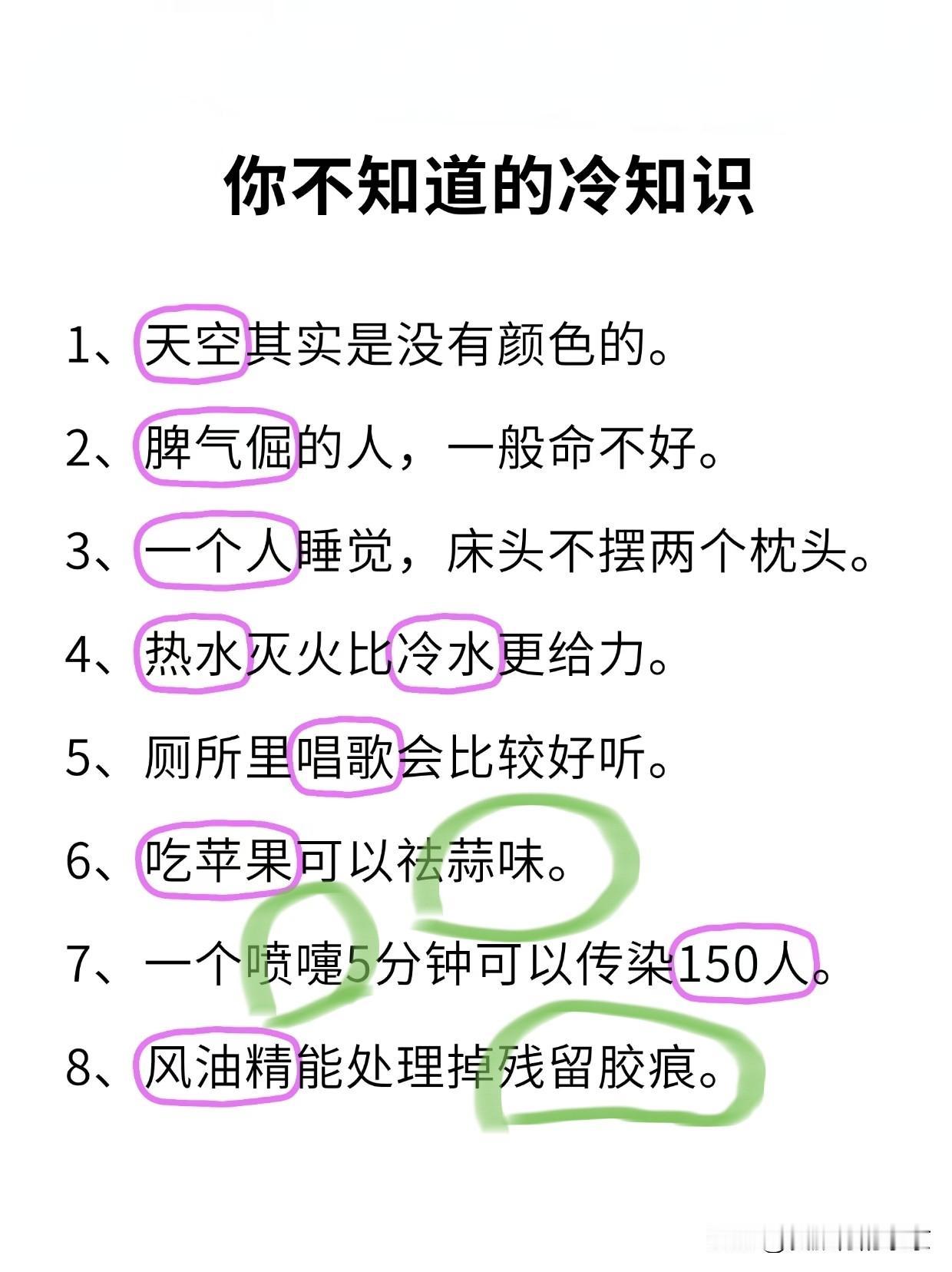 这些“冷知识”你知道吗? 经常喝咖啡☕的人,不招蚊子🦟 女生放的P比男生放的P多 吃苹果🍎能祛蒜味儿🧄 脾气倔的人一般命不好 人吃的太饱,记忆力会变差 热水灭火🔥比冷水灭火🧯更给力 在厕所里看书,更容易记住 字写的✍🏻丑的人通常都更聪明些 眼睛👀大的女生相对来说更爱花钱 喜欢“黑长直”的,基本上都是钢铁直男... 你还知道哪些冷知识?