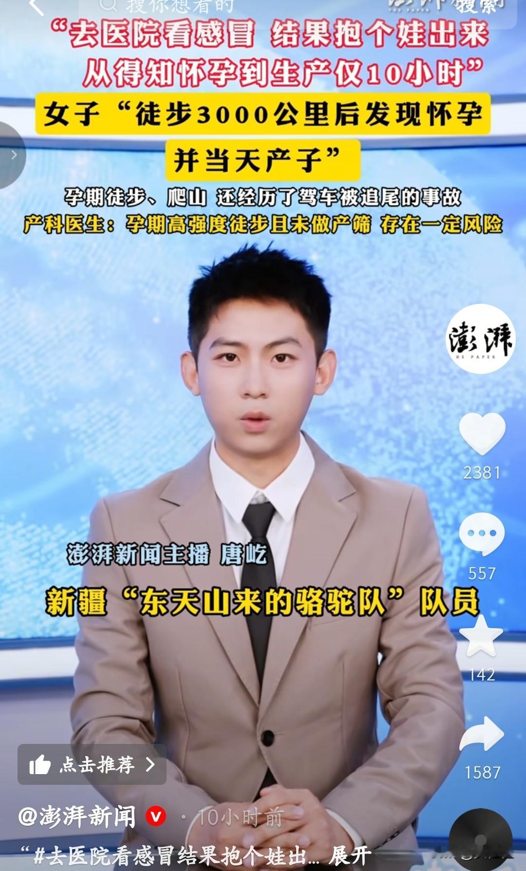 这位新疆“东天山骆驼队”的队员小董,除夕前给了自己一个惊喜,给了大家一个惊吓啊!感冒去医院,居然生了个娃! “东天山骆驼队”刚走完3000公里徒步,期间还爬过山、经历过车祸,谁能想到小董肚子里还揣着个娃。 2月13号她去医院看感冒,一查才知道自己怀孕了,从知道怀孕到孩子出生,前后才10个小时,直接抱了个娃回家。 马上就除夕了,这份从天而降的新年礼物,让这个年过得格外热闹。祝这小董和宝宝都平平安安,也祝大家新的一年都有好运!