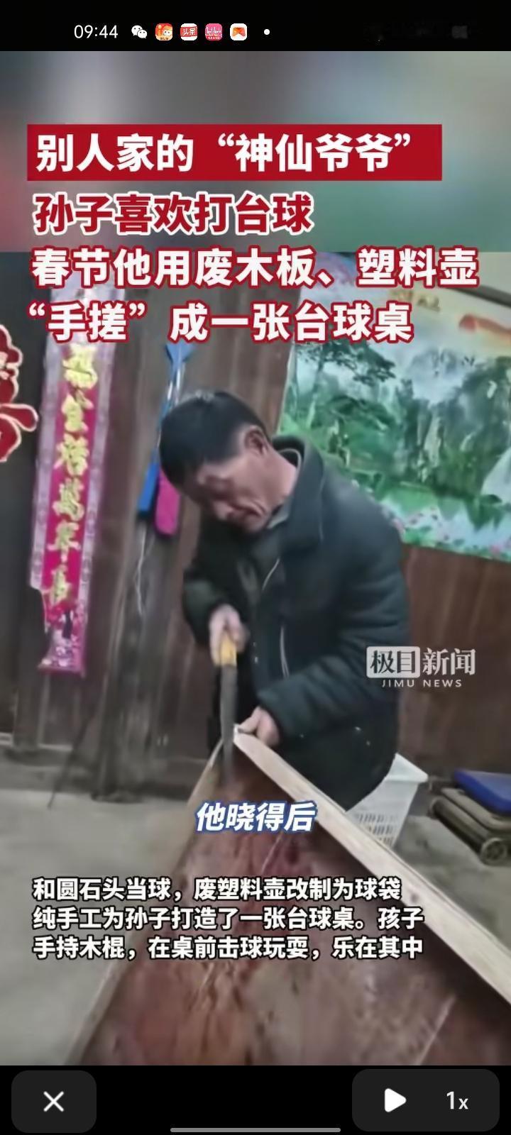 2月12日,恩施州鹤峰县。春节假期,爷爷担心返乡过年的孙子没玩具会无聊,利用家中闲置的木板做桌面,乒乓球和圆石头当球,废塑料瓶改成球袋,纯手工为孙子打造台球桌。孩子手持木棍,在桌前击球玩耍,乐在其中。 原来,真正的顶配童年,从不是橱窗里的标价,而是有人把你的 “不无聊” 放在心上,用岁月的巧手,将平凡日子打磨成独一份的限量版温柔。 这张用旧木板和塑料瓶搭起的台球桌,或许是这个春节最 “简陋” 的玩具,却也是最珍贵的礼物。商场里的潮玩会过时,流水线的快乐会褪色,但爷爷掌心磨出的温度,和这 “全球仅此一款” 的爱意,终将成为孩子长大后,回望故乡时最暖的底色。
