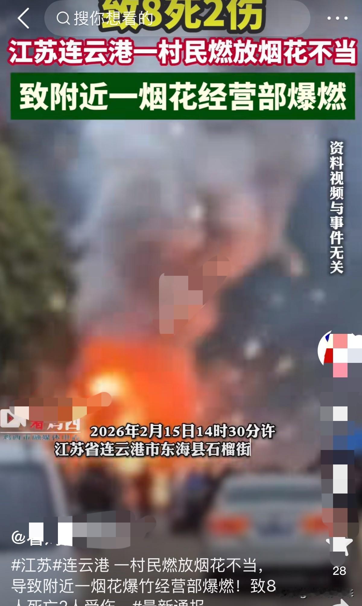 切记:烟花虽美,却是暴脾气,惹毛了它会很致命…… 今儿就是年三十了,不曾想前一天出了这么大的事——江苏连云港东海县传出了噩耗,因燃放烟火出意外引发火灾,导致八人身亡!真让人心里难过! 简直令人难以置信,一村民在烟火销售部旁试燃礼花,结果烟花倒地,引燃了经营部,瞬间引发大火,造成8人身亡、两人受伤的惨剧! 过年讲究的是团团圆圆,欢欢喜喜,这下好了,8个家庭不是贴对联、挂红灯笼,取而代之挂白幡了![流泪] 明知道烟花是危险品,那个村民还在销售部门口燃放,不但毁了别人家,让8条生命枉死,自己这辈子也算到头了!不但要赔偿,而且要把牢底坐穿! 当地的监管部门也坐不住了!规章制度不能只贴在墙上,若监管到位何至于此?肯定要有相关人士为此负责,乌纱不保,甚至被更严厉地追责! 今天年三十了,可以想象八个逝者家庭,团圆饭变成了祭奠仪式,让生者情何以堪啊! 都知道有危险,却都不当回事!直到出事了再追悔莫及,这就是此事的深刻教训!“后人哀之而不鉴之,亦使后人而复哀后人也”!经历此惨痛教训,望类似悲剧不再![祈祷]