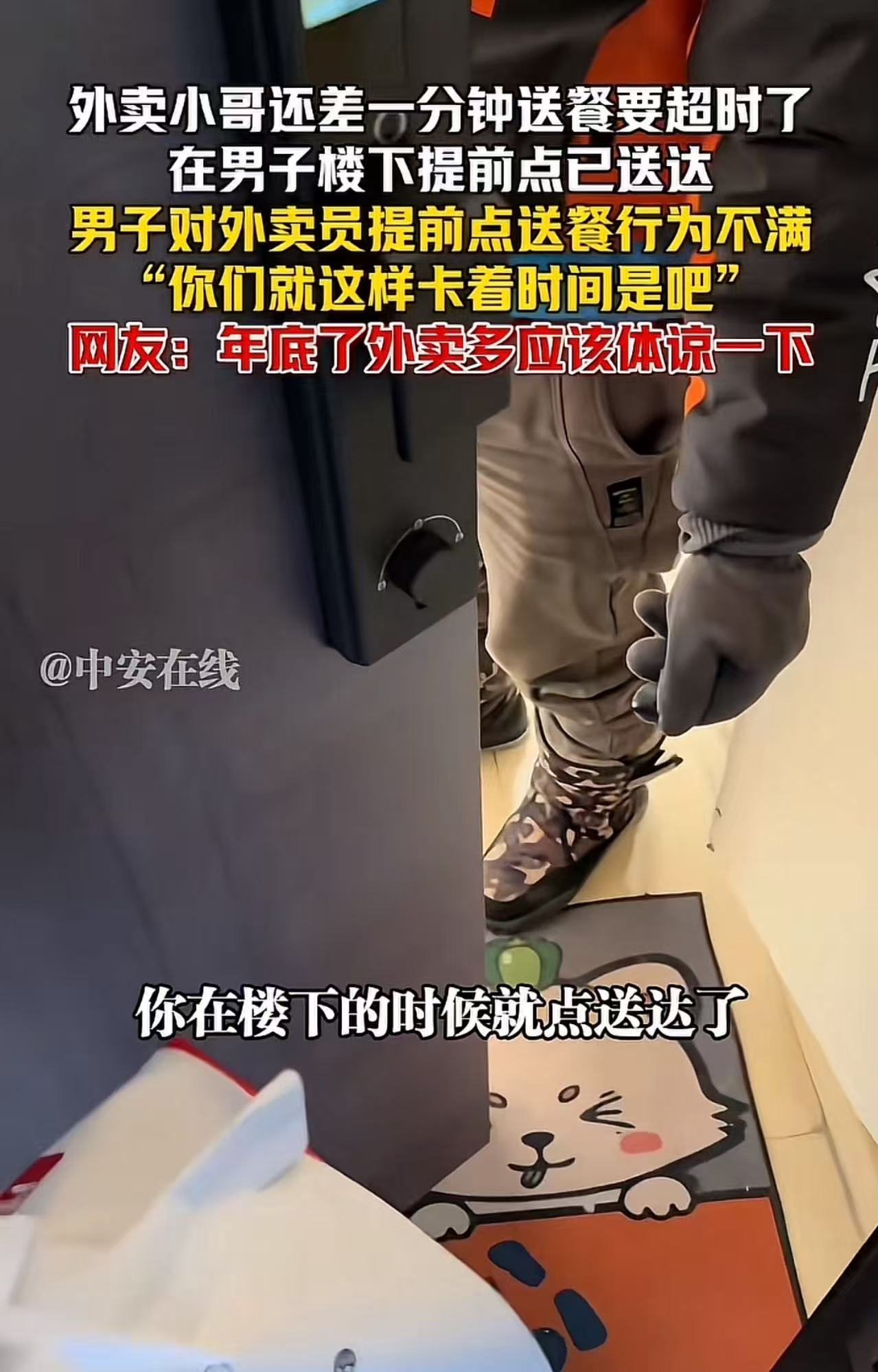 上海,外卖小哥送餐还差一分钟要超时了,在楼下提前点了送达。点餐的男子对外卖员提前点送餐行为不满,质问:“你们就这样卡着时间是吧?”而外卖小哥的态度,让网友炸锅了!