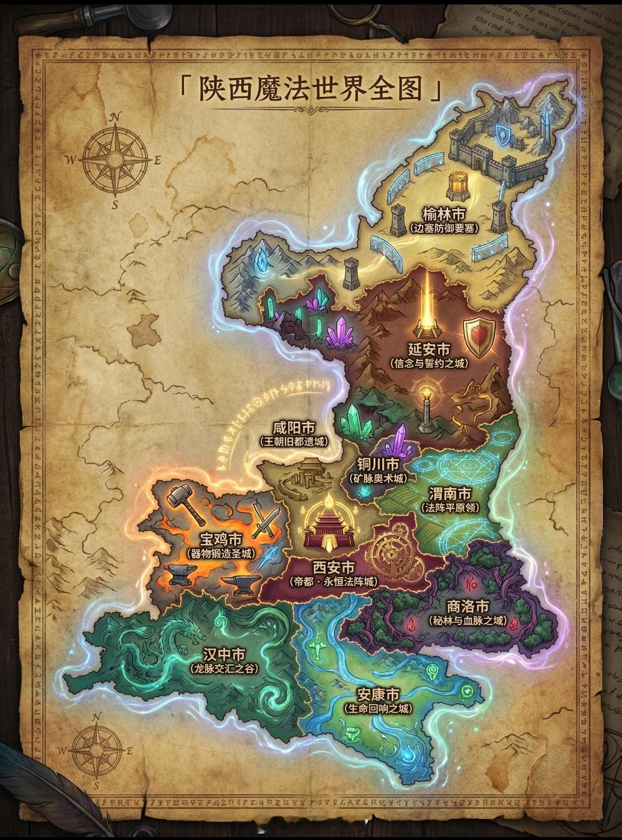 哈哈哈哈,如果陕西是一片魔法大陆,你所在的是什么地方?西安|帝都·永恒法阵城咸阳|王朝旧都遗城宝鸡|器物锻造圣城渭南|法阵平原领铜川|矿脉奥术城延安|信念与誓约之城榆林|边塞防御要塞汉中|龙脉交汇之谷安康|生命回响之城商洛|秘林血脉之域