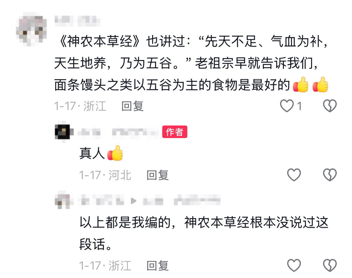 “所有爱好养生的家人们,你们一定要知道,我们活着不需要蛋白质、不需要维生素、不需要膳食纤维。不需要西方人跟我们讲我们需要什么,这些营养、那些营养的。我们是中国人,我们需要的是气血。”刚刚刷到的一位“养生大师”在短视频中如此说道。很难想象这是2026年的言论,并且还有人相信并照做。也有网友在评论区逗她。