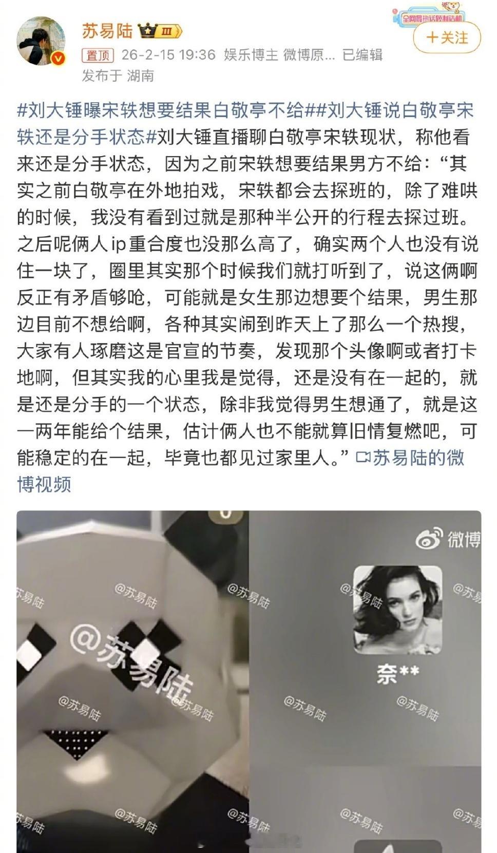 白敬亭宋轶最新的热搜快进到催婚 最新进展,刘大锤说宋轶想要结果(结婚),但白敬亭暂时不想给…2024年拍《难哄》时就分手了。她好刚噢,粉丝越破防越换