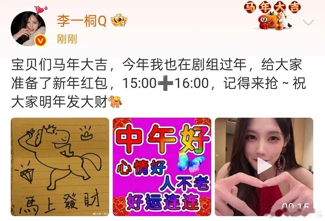 李一桐除夕发红包李一桐预告下午三点,四点,五点给大家发红包!!桐姐真是散财桐子,燥候女神赶紧把手伸进桐桐钱包里暖暖🥹李一桐给大家准备了新年红包