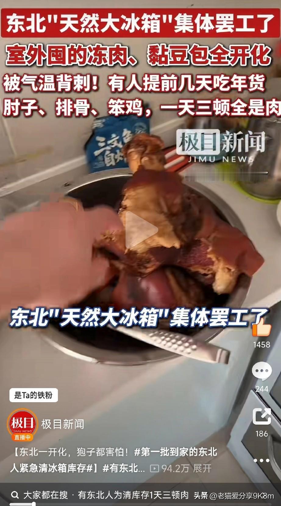 看我们国泰民安的日子, 肉多到吃不完。 以前零下30度的“天然大冰箱”说罢工就罢工,现在家家户户的冻肉、冻饺子全部解冻了! 昨天看新闻,沈阳老铁发帖哭诉:“阳台的排骨、肘子、笨鸡摆得整整齐齐,眼瞅着要开化,全家齐上阵,三顿吃肉吃到想吐!” 评论区直接炸锅: “我家双开门冰箱+俩冰柜全塞满,后备箱都成了‘移动肉库’,还是装不下!” “以前开化得等出正月,今年春节晚,年货直接‘被迫提前退休’!” “现在吃饭——早上肉包子,中午炖排骨,晚上酱肘子,吃肉吃到打嗝都是肉味!” 要说这东北囤年货的阵仗,那是嘎嘎硬核!500斤猪肉、整只羊、鸡鸭鹅齐上阵,院子里摆得跟“肉山”似的。以前靠天儿冻,现在天儿“叛变”,只能跟肉肉“拼命”! 不过咱也有招:煮熟的放冰箱,吃不完的腌起来,实在不行——喊亲戚朋友来“帮忙”! 毕竟,国泰民安的日子,肉多到吃不完,也是一种“甜蜜的烦恼”呀~ (文章素材来自极目新闻,侵删)