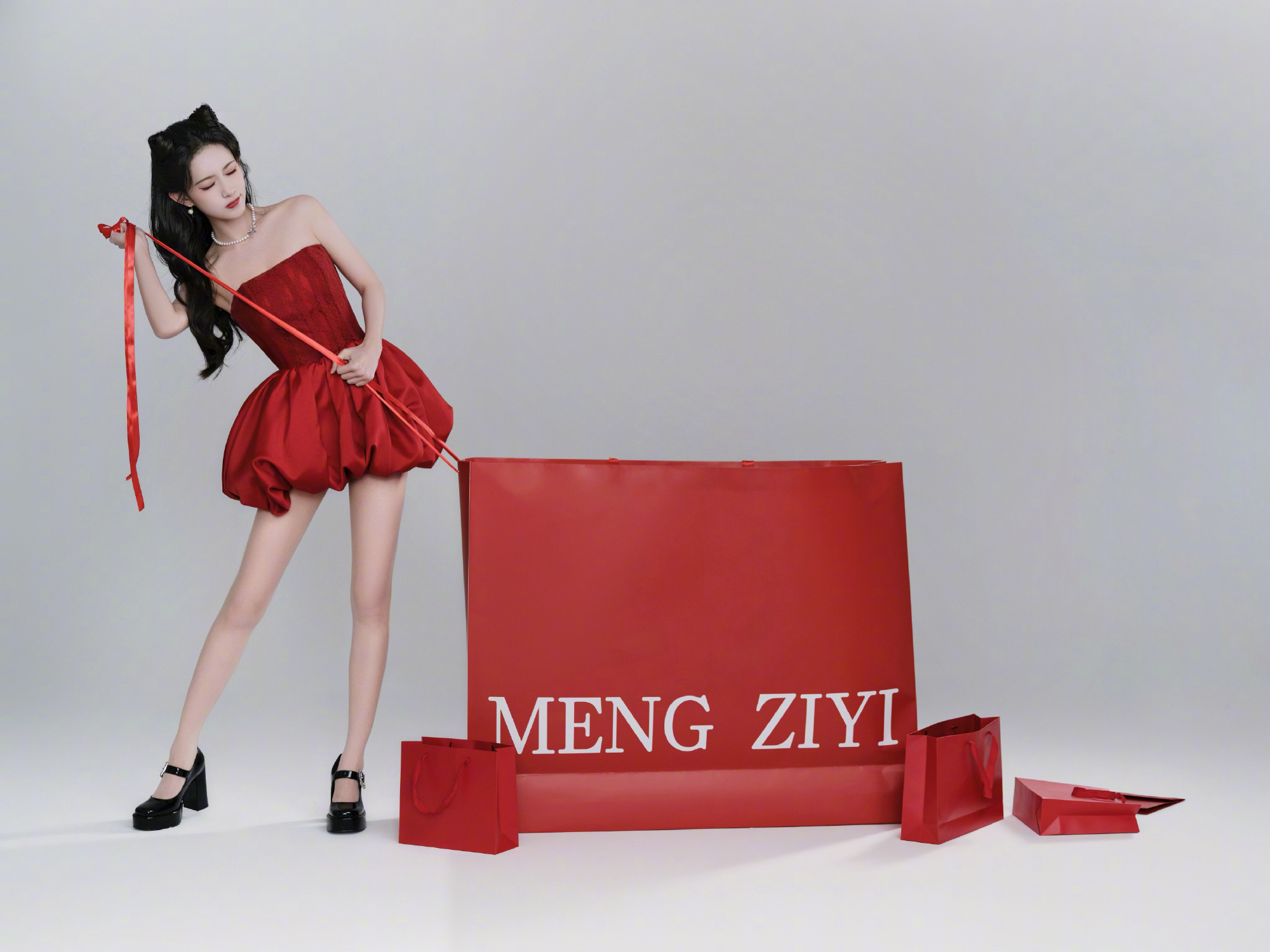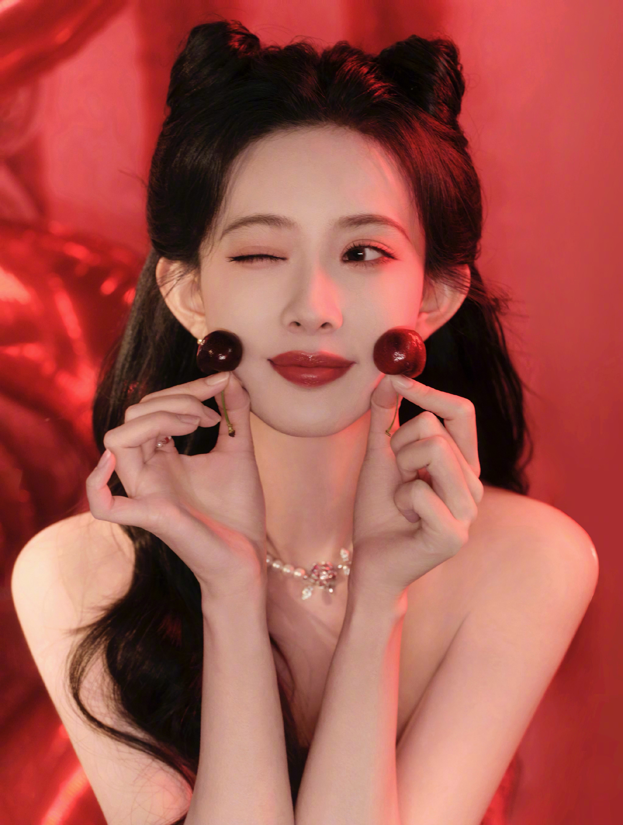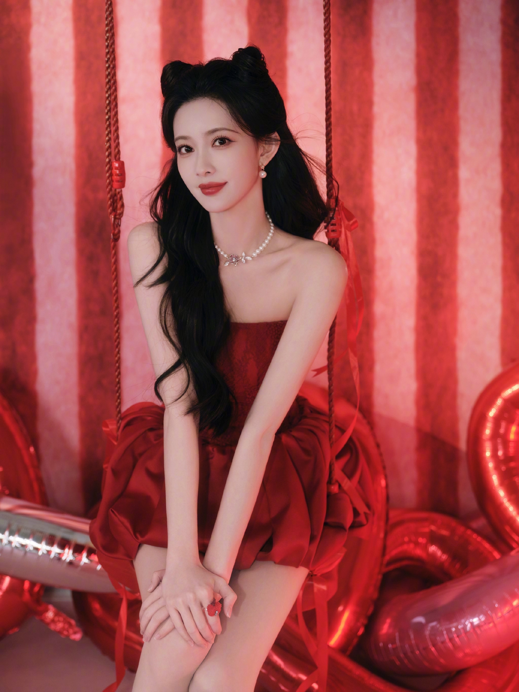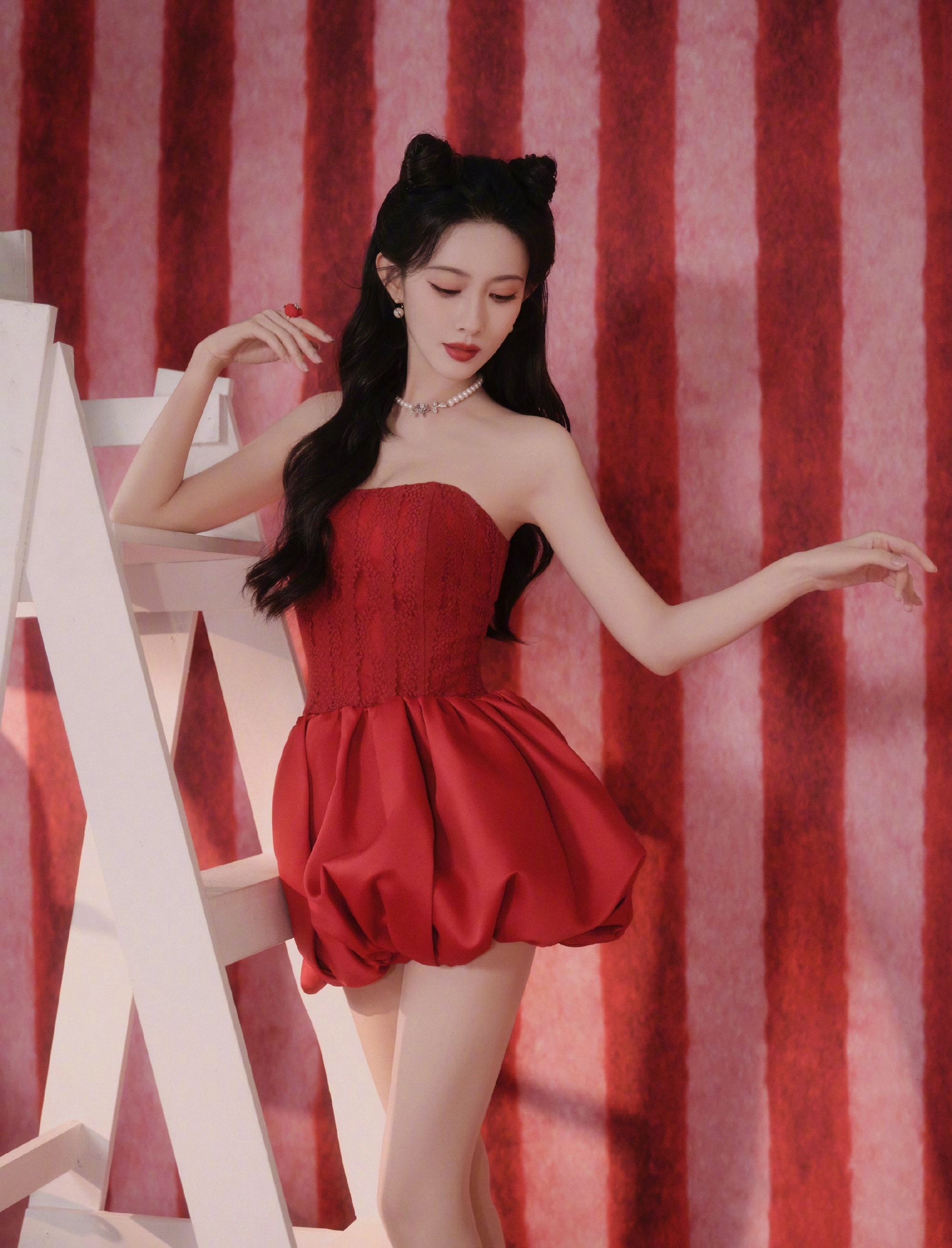 孟子义 新春大片,红色抹胸短裙,珍珠配饰点缀,再配上猫耳发型,俏丽又甜美,把好运“袋”回家。🍒🎆🎀 新春茶话会春晚