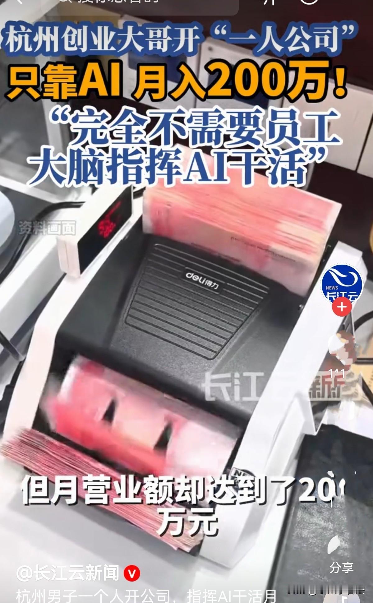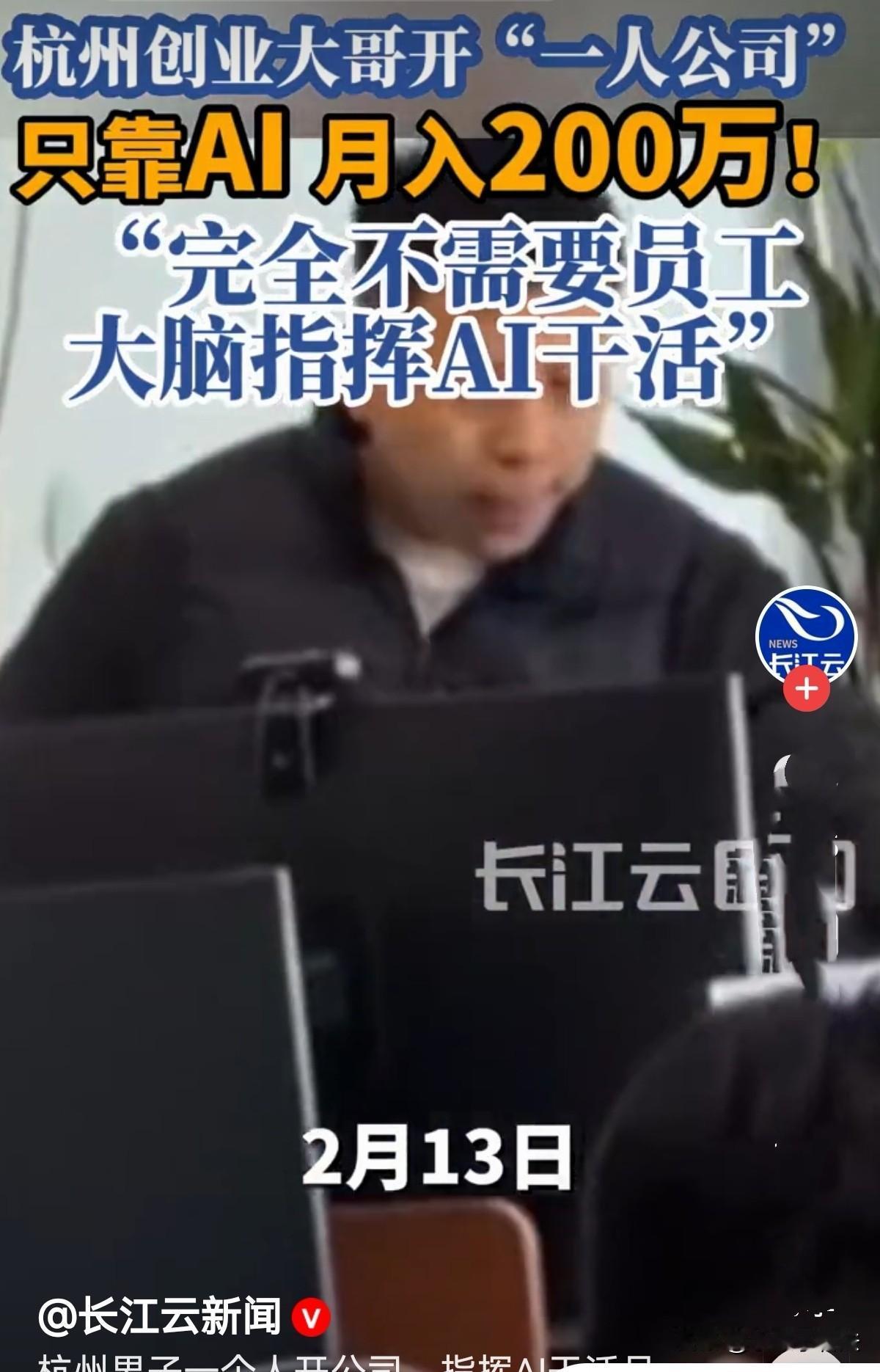 太聪明了!浙江小伙大学学的是船舶与航海专业,毕业后跑船一年在外漂泊就厌倦了,想创业,成本高风险大,房租贵,人工、设备开销大,吓得不敢迈步,最后他一人一屋一AI,自己开公司,竟月入7位数,春节都不休息,却笑着说一点“班味儿”都没有! 刘先生大学学的是船舶与航海专业,毕业后也顺理成章地上船工作,本以为是份稳定又体面的工作,可真正跑船不到一年,他就彻底厌倦了。 看似还不错的工资,在常年漂泊的海上根本没地方花,日复一日远离家人、远离陆地的生活,让他心里满是憋屈,他打心底里明白,这不是自己想要的生活,转行的念头,从那时起就深深扎在了心里。 他也想过创业开公司,自己当老板摆脱打工人的身份,可一琢磨传统创业的模式,心就凉了半截。 租办公场地要花钱,买设备要花钱,招员工更是大头,每一笔都是真金白银的投入,还没开始赚钱,就得先背负巨大的成本压力! 万一短期内没收益,很可能直接亏本收场。 一想到这些,刘先生就犯了难,既不想放弃创业梦,又不想承担高风险,他一直在等一个合适的机会。 直到去年,AI行业彻底火了,身边不少朋友靠着AI赚得盆满钵满,刘先生眼前一亮,一个大胆的想法突然冒了出来:为什么非要按传统方式开公司? 我能不能只靠自己,再加上AI打工?这个念头一出现,就再也压不下去,他当即决定,就这么干! 说做就做,刘先生花几百块租了一间小小的单人出租房,屋里没有豪华的装修,只有一套简单的桌椅、一台配置够用的电脑,再加上一套稳定的AI工具,这家只有他一个人的公司,就算正式开张了。 他既是老板,也是唯一的员工,不用给别人发工资,不用操心场地开销,所有成本降到了最低,而所有的收益,也都归自己所有。 很多人觉得,一个人开公司肯定忙得脚不沾地,可刘先生却把日子过得轻松又高效。 他不用像普通员工一样做繁琐重复的工作,只需要坐在电脑前,把指令和需求输入AI,设定好程序,剩下的脏活累活、机械性的工作,全都交给AI去完成。 他做海外业务,只需要做好核心的事:把控工作方向,跟进客户需求,验收AI产出的成果,保证质量不出错。 他就像一个精准的掌舵人,不用亲自划船,却能掌控整条船的方向,看似是甩手掌柜,却把每一个关键环节都握在手里。 就这样坚持了大半年,刘先生的努力和聪明的选择,终于迎来了回报,月收入200万营业额,突破7位数,这是他以前跑船想都不敢想的数字。 今年春节,家家户户都在团圆休假,刘先生却依然坐在出租屋里忙碌,换做别人,过年加班早就满是怨气了。 可他却笑得格外开心,还打趣地说:别人除夕加班是给老板打工,浑身都是班味儿,我加班是给自己赚钱,累不着,还能多挣钱,一点班味儿都没有! 这番话,妥妥的凡尔赛,却也藏着他选对路的得意。 这件事传到网上,瞬间引发了网友们的热议。 不少人都佩服刘先生的头脑,说他不是靠蛮干,而是靠认知和灵活的思路赚钱,在别人还在死守传统模式时,他已抓住了AI的风口,用最低的成本,创造了最大的价值。 也有网友理性提醒,刘先生的成功离不开他的眼光和魄力,普通人不要盲目跟风,找准适合自己的路才最重要。 不得不说,刘先生真的把“聪明”用在了刀刃上。 他没有被固定的思维困住,没有被高成本的创业门槛吓退,而是抓住时代的风口,用最简单的配置,走出了最赚钱的路。 这也让我们明白,真正的成功,从来不是拼体力、拼成本,而是拼思路、拼认知。 可有人不信说,挣钱的门路就像皇位一样,只有父传子这途径!凡是告诉你有挣钱门路的,是要来挣你的钱了! 有人还说,能干这个活的人多了去了,能接到活,才是最难的,我认识一个人也是自己开公司,生意全是看他爹面子来的,他也说挣钱简单! 对此您怎么看?