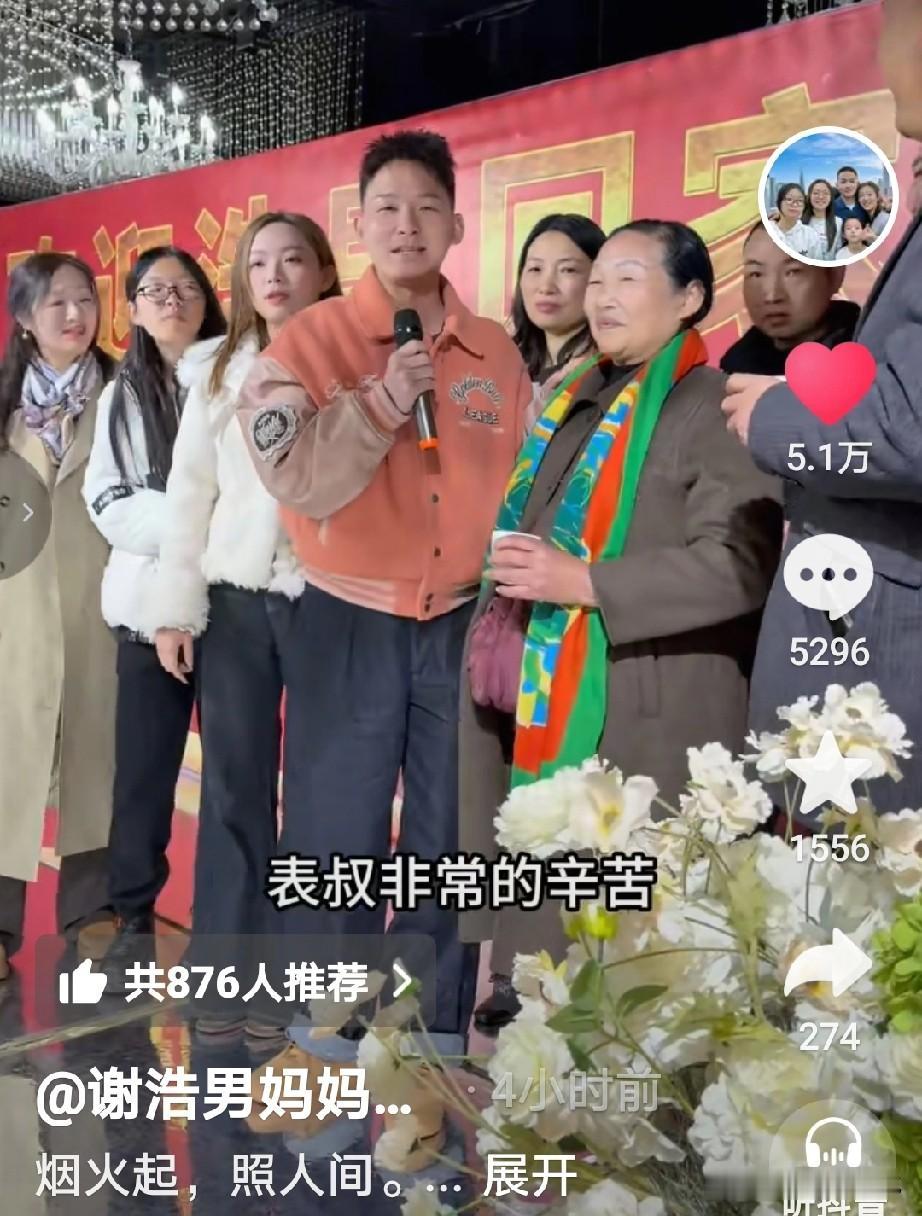 不得不说:许建华这回真的扳回一局,干的漂亮。 刚刚看到许建华在老家那边给谢浩男办认亲宴, 这一次是没有谢岳,只有娘家人, 有谢浩男的姥姥,姥爷,小姨,小姨夫,还有舅舅,舅妈,娘家那边的所有亲戚见证谢浩男回家。 然而这个认亲宴办的才是最实在的,谢浩男给大家敬酒都是有红包的,兜都装不下了, 然而谢岳办的认亲宴只有画大饼,没有看到任何一个人拿出来红包给谢浩男的,