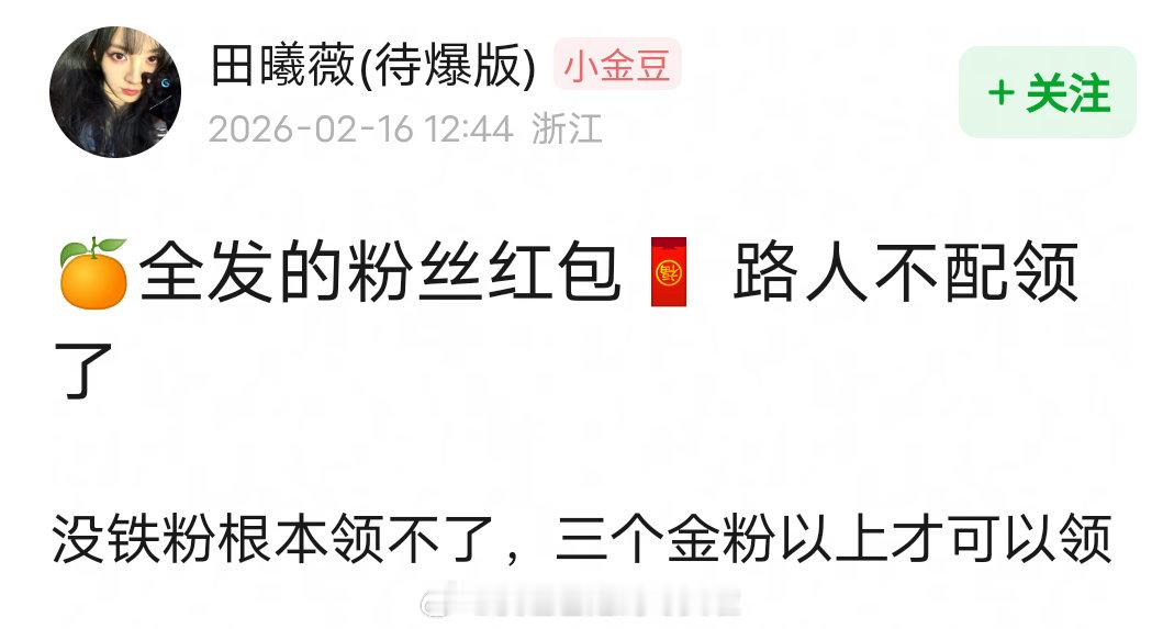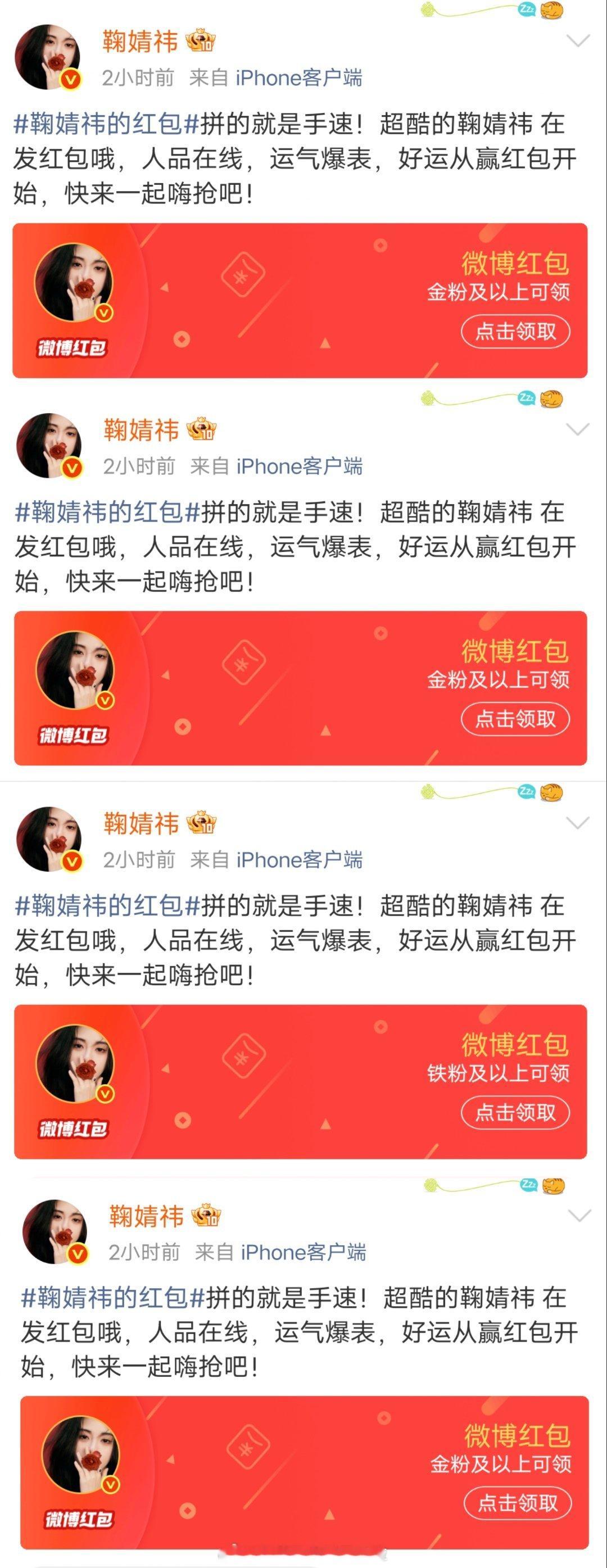 鞠婧祎20万红包 明星红包 鞠婧祎发了四个总计20万的红包,只有铁粉和金粉才能领,因为设置了较高的门槛被审判了。但是鞠婧祎本来也不在微博的发红包名单啊,没和平台合作全是自己出的钱,作为个体户,去年还面临前司的合约纠纷,自掏腰包感谢一直以来支持的粉丝,没有任何不对吧。