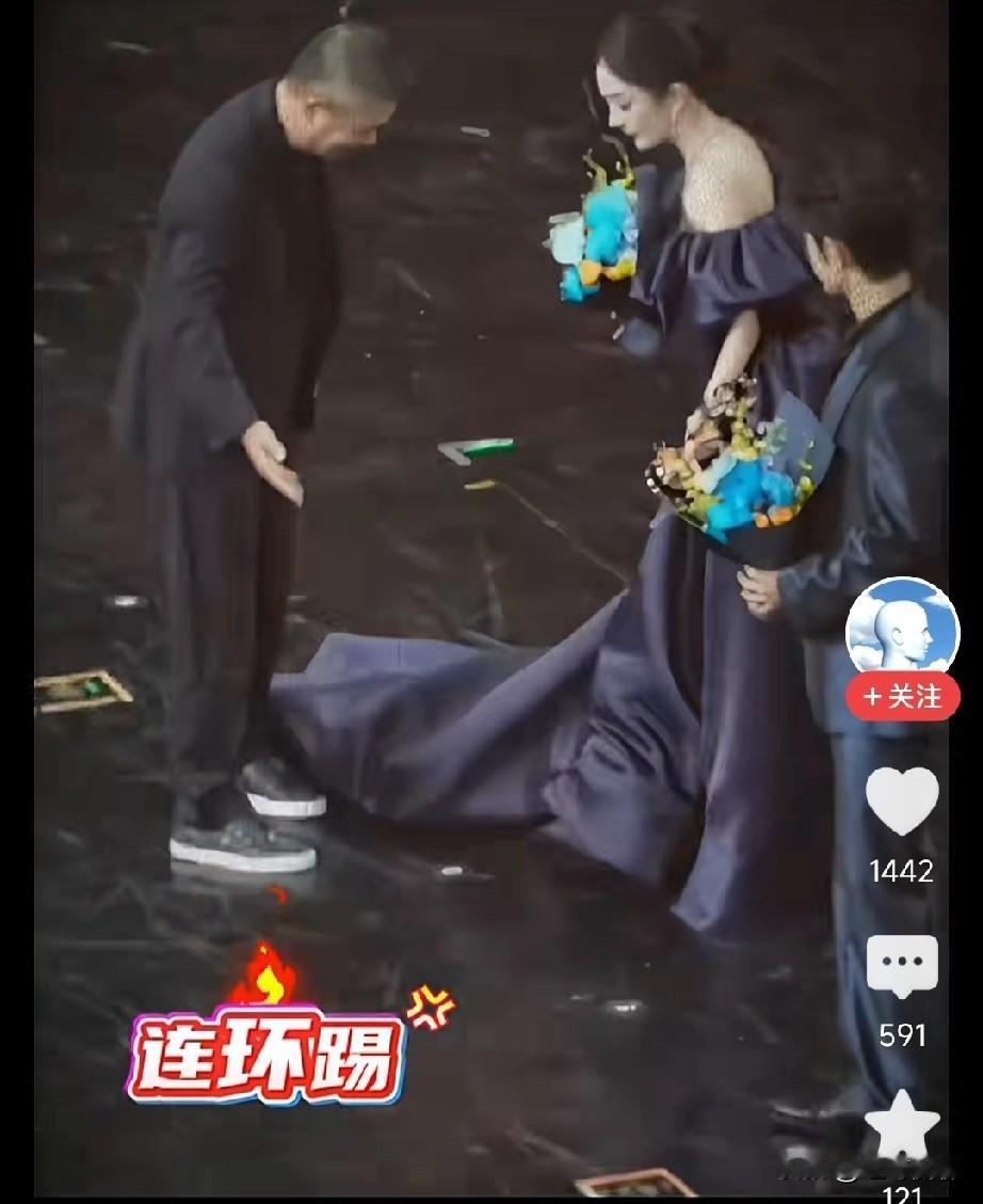 这个大年龄的男人是谁啊?怎么能把人家女士的长裙用脚踢呢?是不知道如何处理下意识吗?还是什么意思?反正众目睽睽之下这个动作的确太不雅了,自降身份!虽然有些服装的确有些夸张!