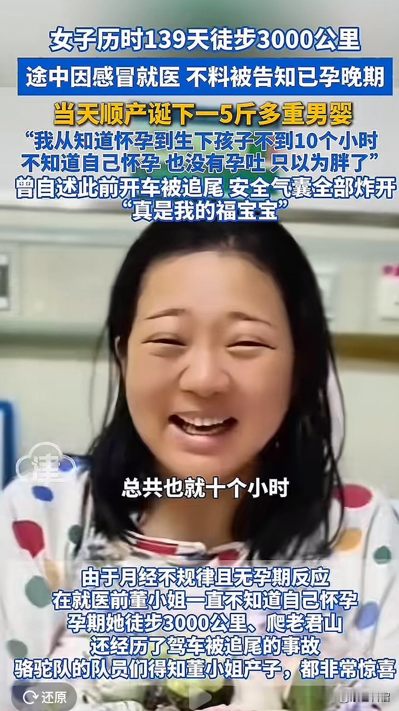2026 年最牛产妇诞生了,这简直太厉害了!从知晓怀孕到孩子呱呱坠地,竟不到 10 个小时。 当事人董小姐是户外爱好者,她跟随骆驼队的户外大军,历时 139 天徒步 3000 公里,还爬过老君山,甚至遭遇过车子追尾事故。她自己压根没意识到怀孕,因为孕期的反应她统统都没有出现。周围人也没人看出她有孕在身,只知道她特别能吃,都喊她“胖丫头”。就连快生产时出现了水肿,胖丫头还以为自己是病毒感染了。 结果到了医院看感冒,医生直接告知:“你怀孕了,而且快生了!”接着她直接被送进产房,几小时后孩子顺利出生,万幸孩子各项指标都很良好! 不得不说,这位孕妇也实在太大意了,怀孕了都浑然不觉,整个孕期肚子里的宝宝都跟着妈妈四处奔波。只能说这个宝宝真的是福大命大!估计是个有福之人! 对此,大家有什么想说的?欢迎在评论区交流。 (图片来源网络)