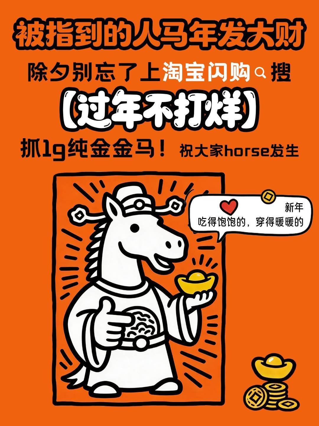 过年上淘宝闪购抓金马赢好运淘宝闪购过年不打烊“金”喜来袭!春节上淘宝闪购搜【过年不打烊】,抽百万份好礼,赢1g纯金金马,新年好运更快到家!看到没,我在抓真正的“金马”!