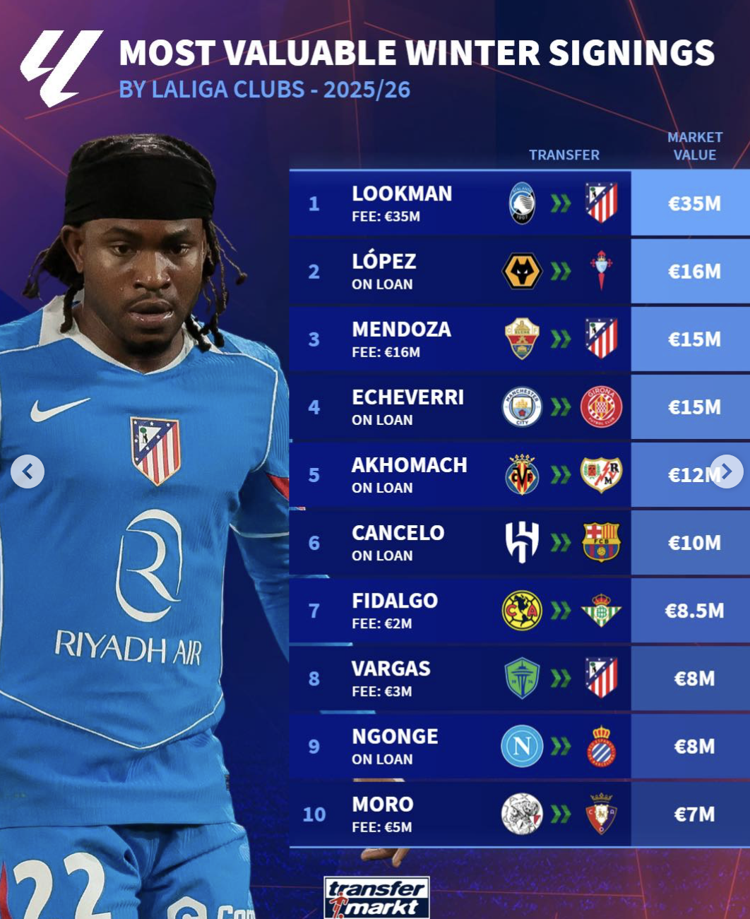 马竞引进的卢克曼和门多萨分别以3500万和1500万的身价排名第一和第三,加盟塞尔塔的洛佩斯以1600万的身价排名第二。