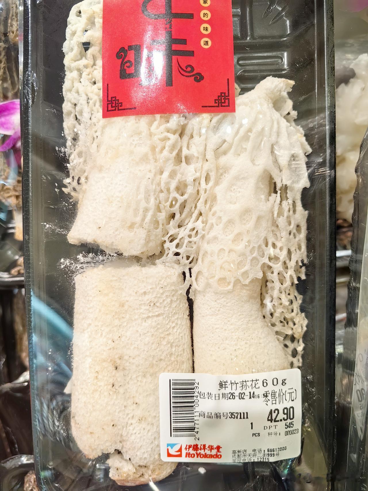 2朵新鲜竹荪42.9元,也不知道是不是竹林里面原生态长出来的。记得小时候,每到六七月份,下雨之后,我们就喜欢往竹林里面钻,就是为了找到一场新雨后的竹荪。闻着伞盖上的那股味道,实在是开心至极。