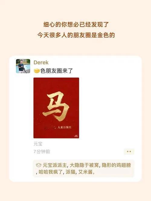 微信新出了个金色朋友圈,就是过年限时玩的特效,只有2月16号到17号这两天能用。 想发金色朋友圈,先把微信和元宝App都更到最新版,不然用不了。一共有两种方法能开这个功能。第一种,打开元宝App,点“创作”,找到“拜年朋友圈”,做好图片直接点发表,就能跳到微信发出去。第二种更简单,在微信状态里发一个“接元宝”,也能直接解锁。 发成功之后,你的朋友圈会特别显眼,跟别人的完全不一样。你的名字会变成金色,点赞和评论的框也都是金色的,特别有过年的感觉。点赞按钮还会变成金元宝的样子,点一下就像在拜年。 最有意思的是,你给别人的金色朋友圈点赞,还有机会掉红包,纯属看运气。 就这两天能玩,过期就没了,大家赶紧去试试,祝大家都能抢到红包,新年发大财! 微信朋友圈 微信封元宝