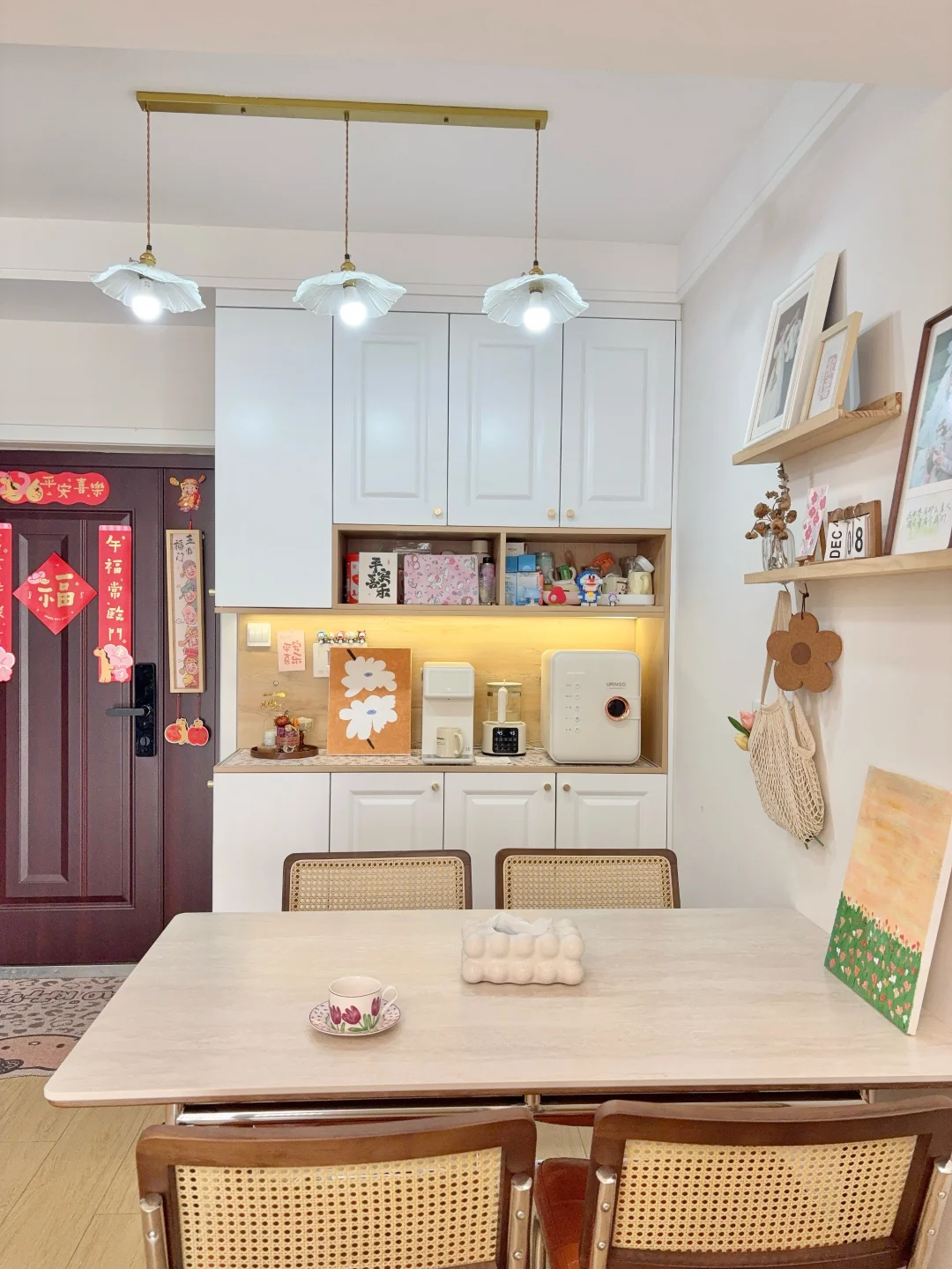 欢迎参观我的小家 入户没有玄关 鞋柜餐边柜一体设计 硬装简简单单 不做复杂装饰 软装就是靠pdd一点点拼凑出来的 入住了两年多 依然越住越爱💓