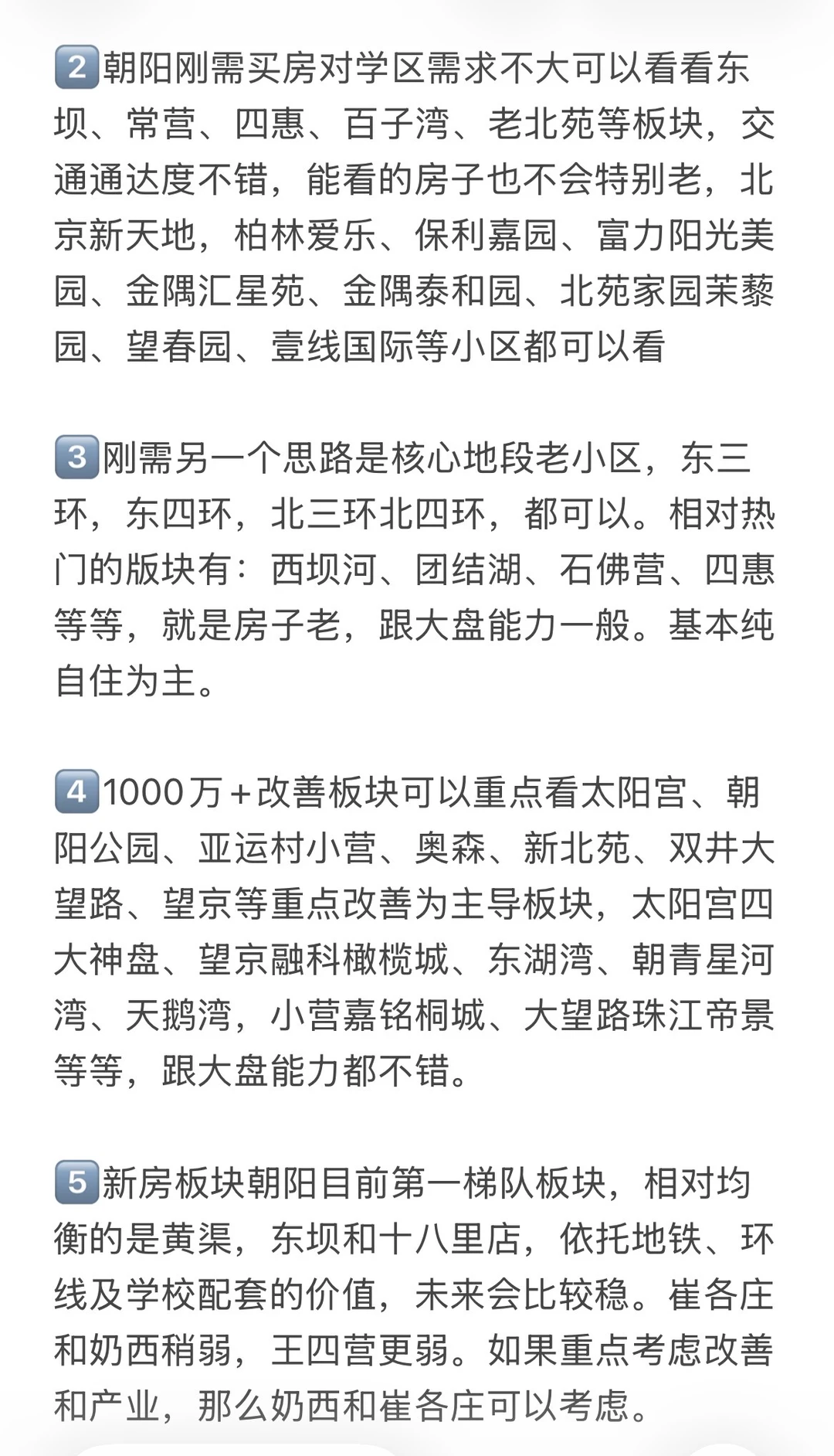 1️⃣朝阳刚需买房对学区需求不大可以看看东坝、常营、四惠、百子湾、老北苑等板块,交通通达度不错,能看的房子也不会特别老,北京新天地,柏林爱乐、保利嘉园、富力阳光美园、金隅汇星苑、金隅泰和园、北苑家园茉藜园、望春园、壹线国际等小区都可以看