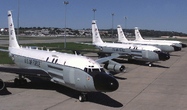 RC-135“铆接”侦察机采用的是波音707客机机体。在机首巨大的黑色整流罩内装有大量的电子天线,配合机内众多的电子侦察设备,RC-135能够对广泛频段的无线电信号进行识别和监听。RC-135的主合同商是美国通信公司(先前属于雷恩锡公司),负责对机身和电子设备的改造。