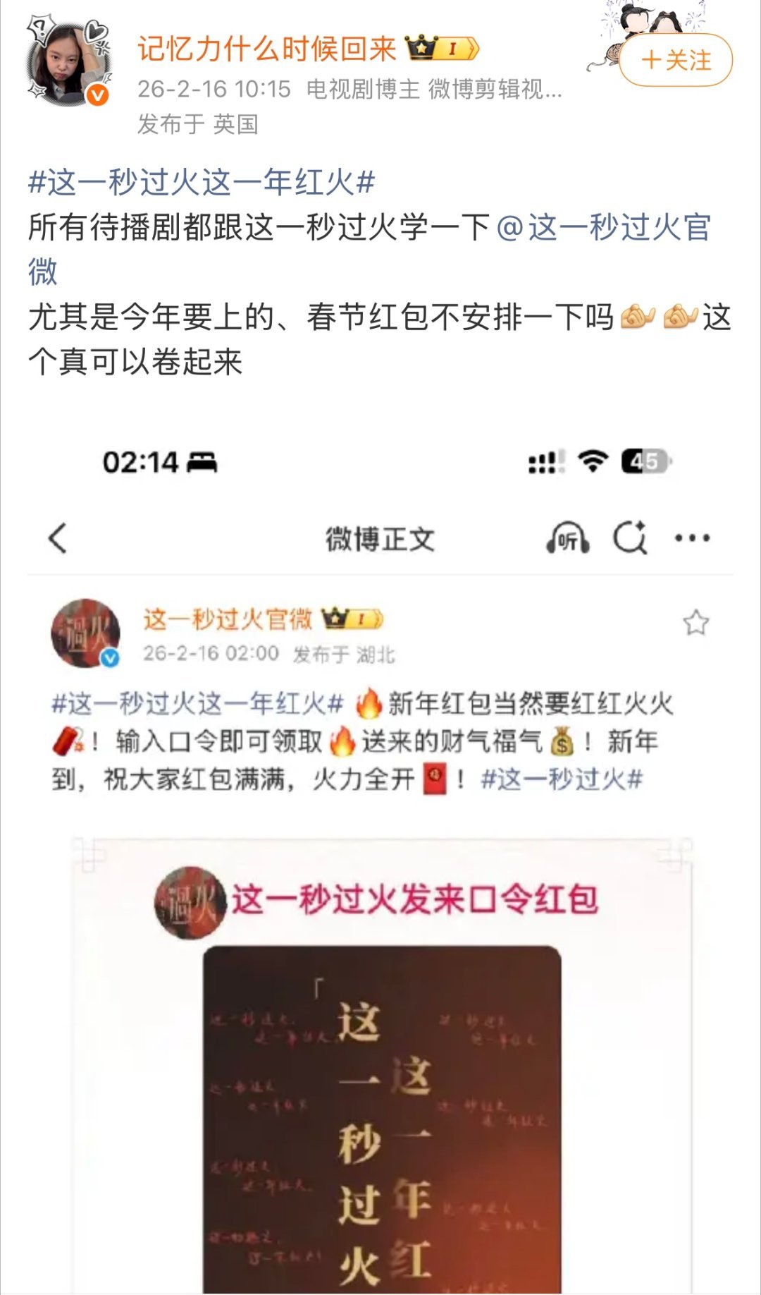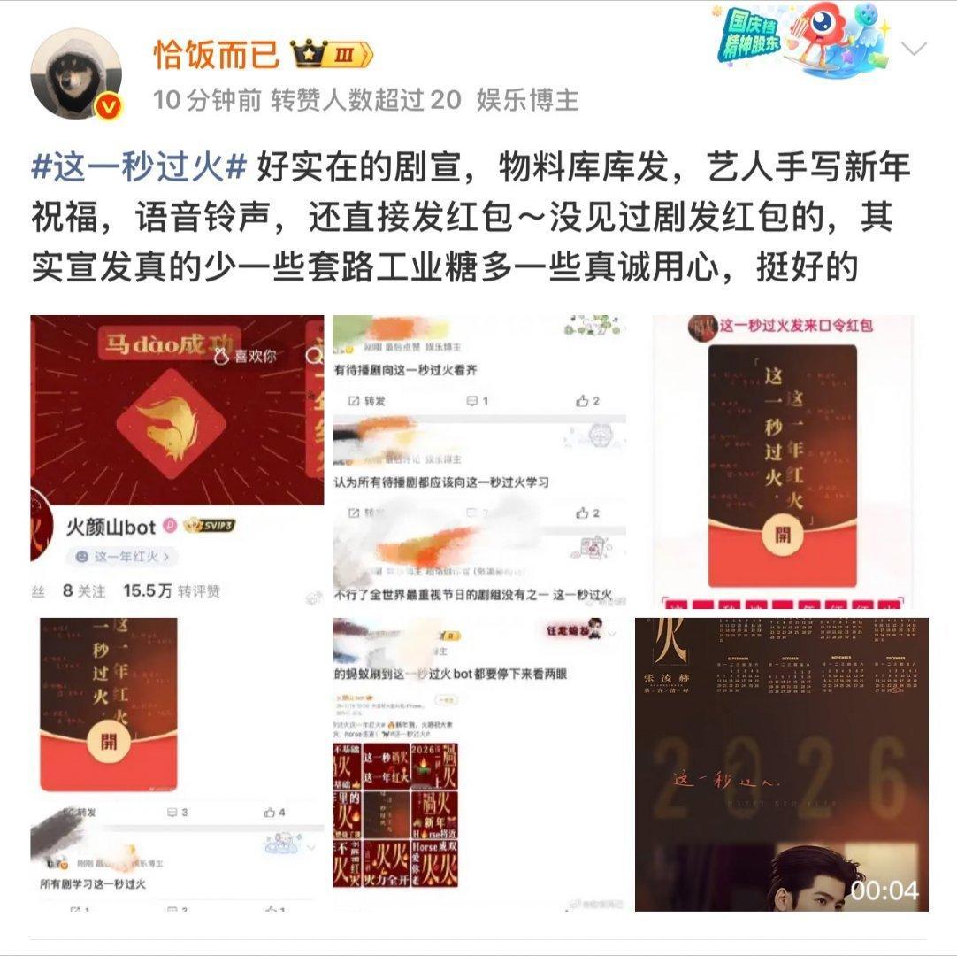 张凌赫王楚然新剧发了1万红包 刷到这条热搜的时候我正在沙发上瘫着,直接一个鲤鱼打挺——什么?直接发钱?《这一秒过火》剧组这波操作也太宠粉了吧!一万块红包发给粉丝,不是噱头不是套路,点进去就能领,这诚意让我这个路人都感动了。我赶紧去看了新发布的剧照,张凌赫和王楚然的颜值在线到爆,关键是每张照片都附带了语音祝福和手写寄语。王楚然的祝福语温柔真诚,张凌赫的声音苏到我反复播放,手写的卡片更是细节满满。能感受到他们对粉丝的用心,这种实打实的宠爱方式比什么营销都来得动人。还没看的姐妹快去围观,就算没领到红包,也能收获一波新年祝福。这剧我肯定要追!这一秒过火