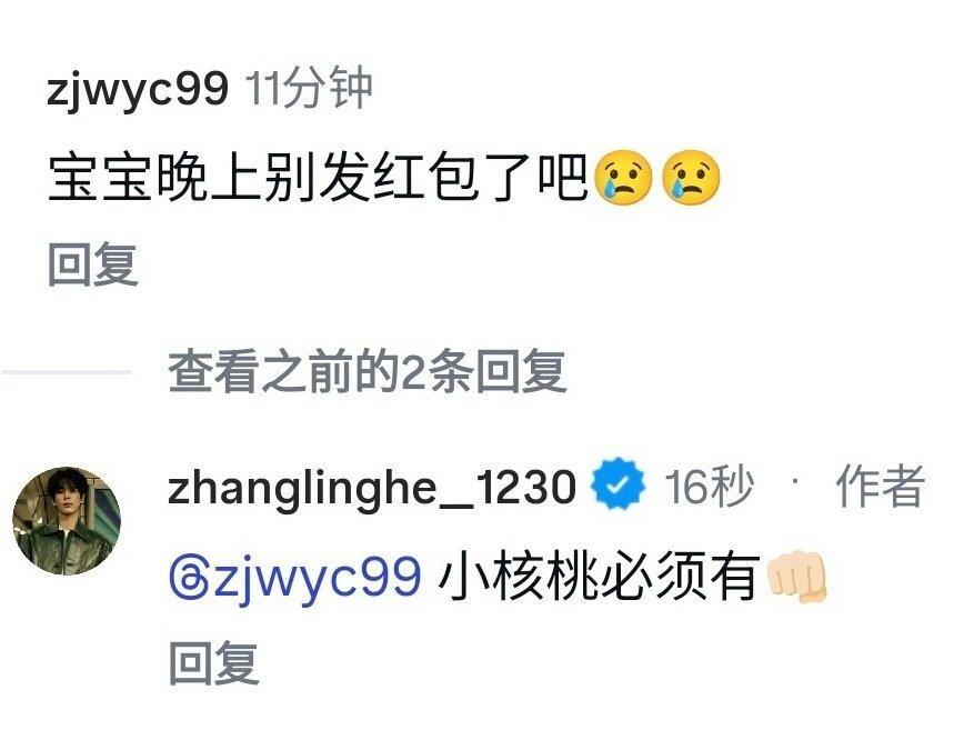 张凌赫 红包预告里显示张凌赫晚上会发七个红包,粉丝留言“晚上别发红包了吧”但是凌赫表示“小核桃必须有”这么宠粉的凌赫去哪找啊