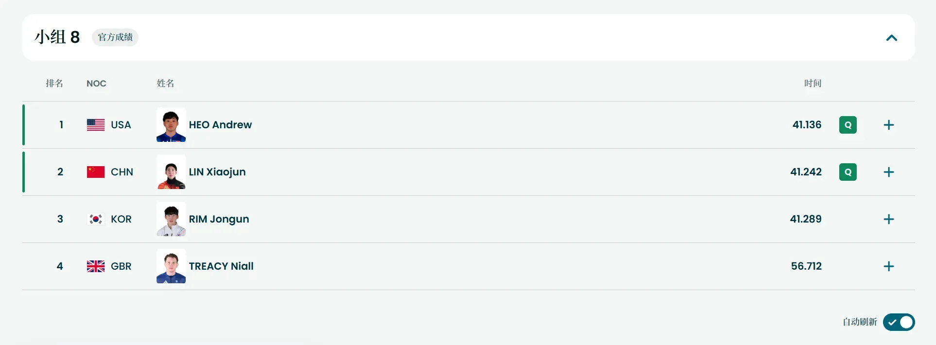 刘少昂第四组出发,滑出41.100,小组第一晋级1/4决赛。林孝埈第八组出发,滑出41.242,小组第二晋级1/4决赛。林孝埈500米顺利晋级