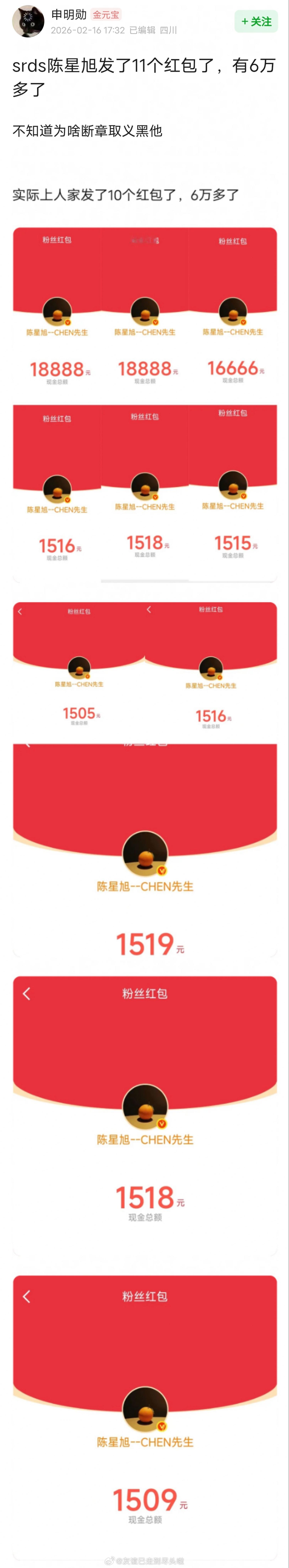 陈星旭发了一整天的红包,有6万多了,三个过万红包是无门槛的,现在还在发,也不能逮着其中一个红包的金额审判吧。明星红包 红包分组 陈星旭红包里有什么秘密