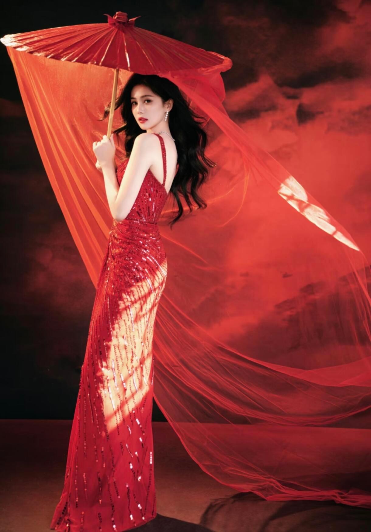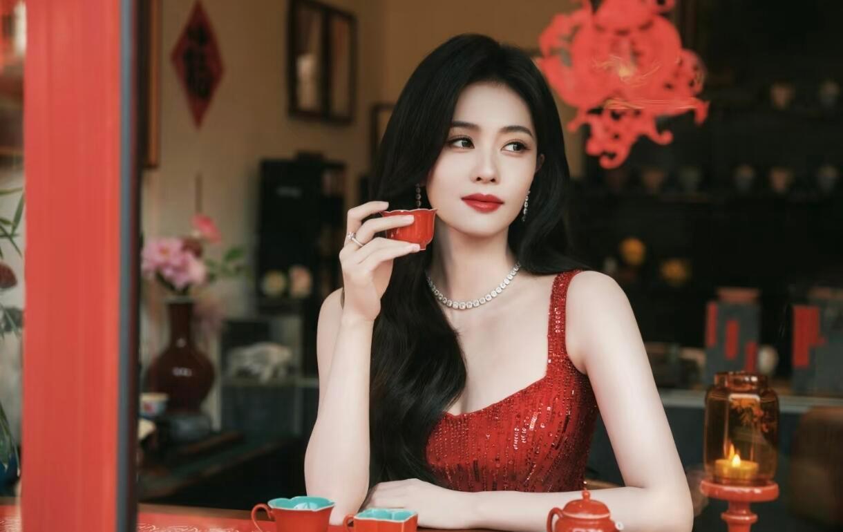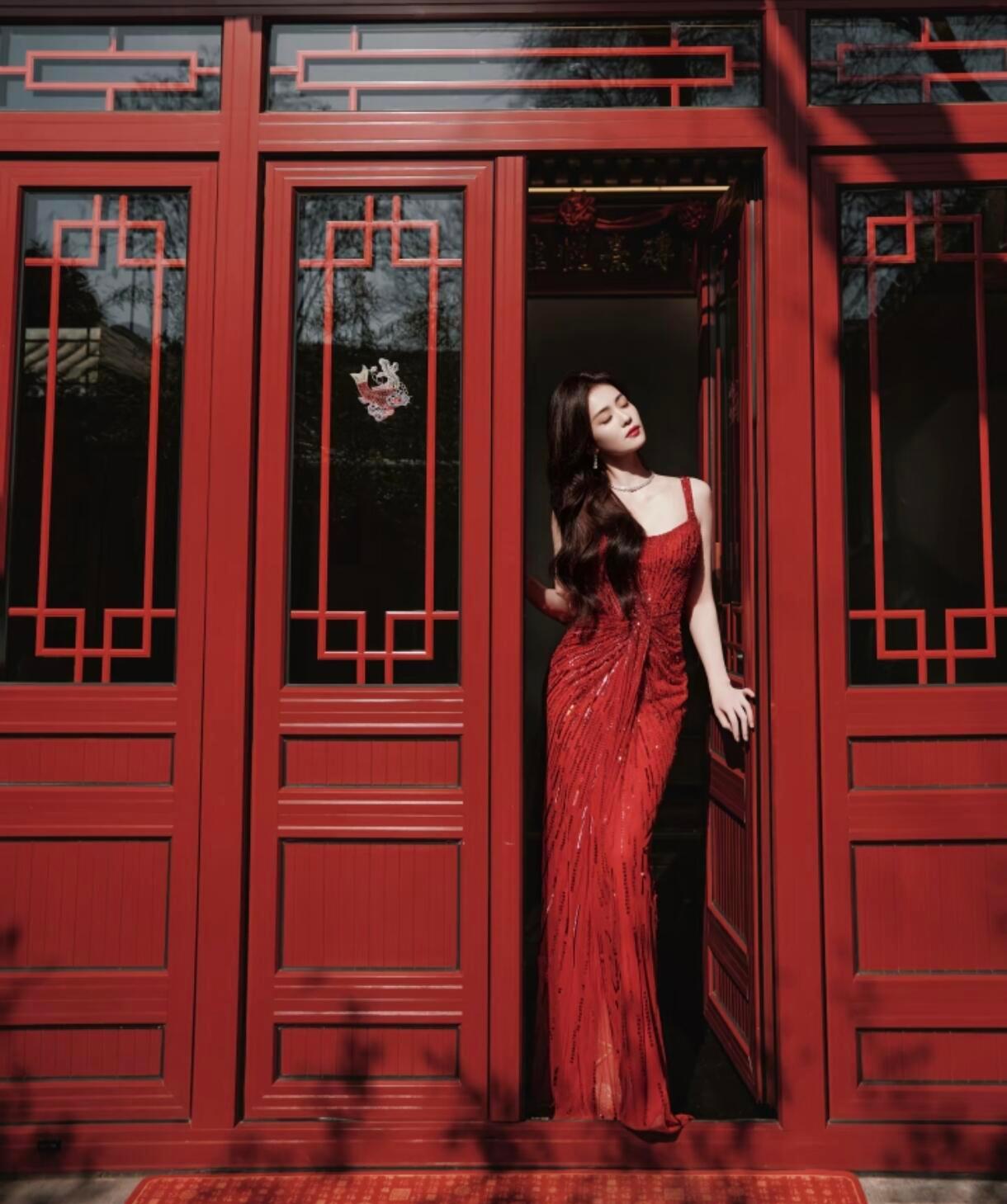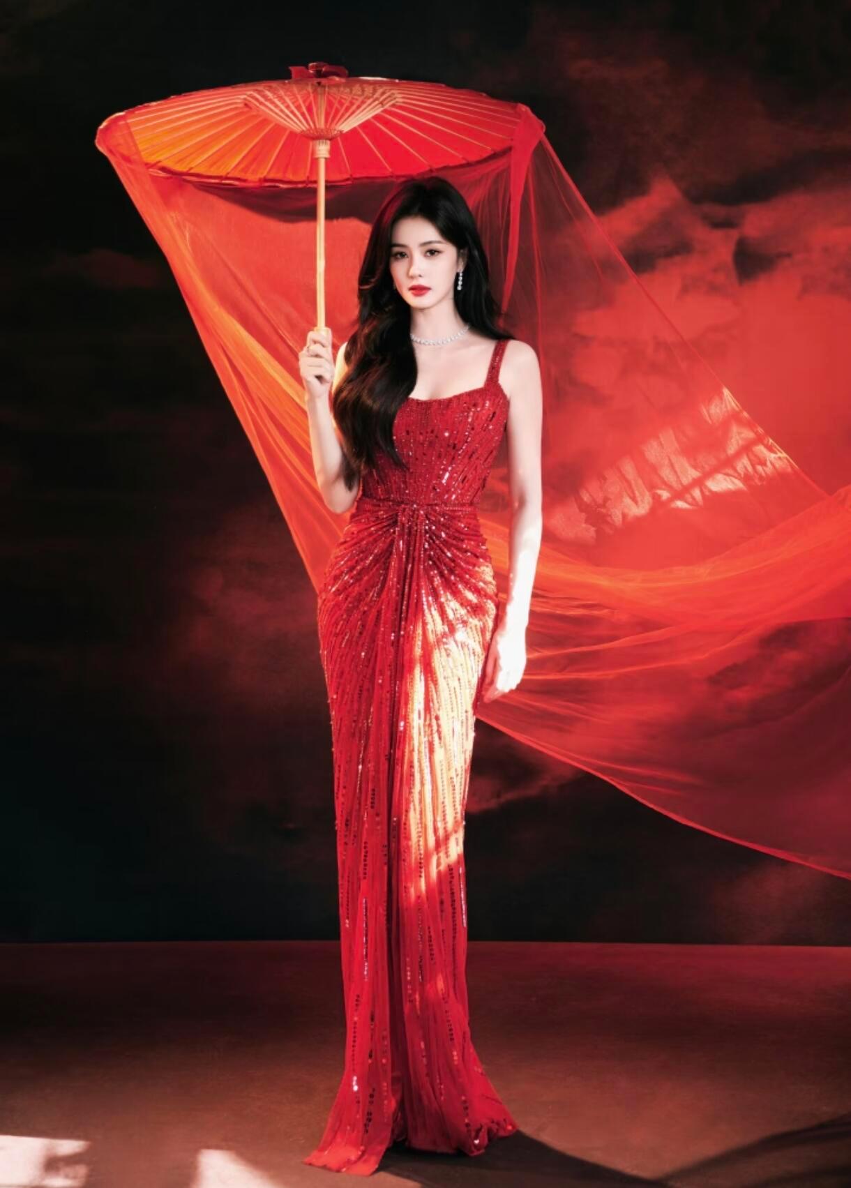 春晚新春茶话会好好过大年白鹿Jenny Packham红色亮片礼服+DE BEERS珠宝,优雅迷人。