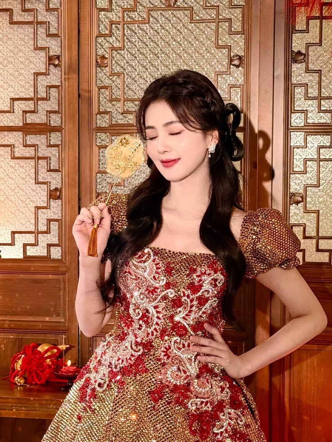 春晚新春茶话会好好过大年白鹿Jenny Packham红色亮片礼服+DE BEE