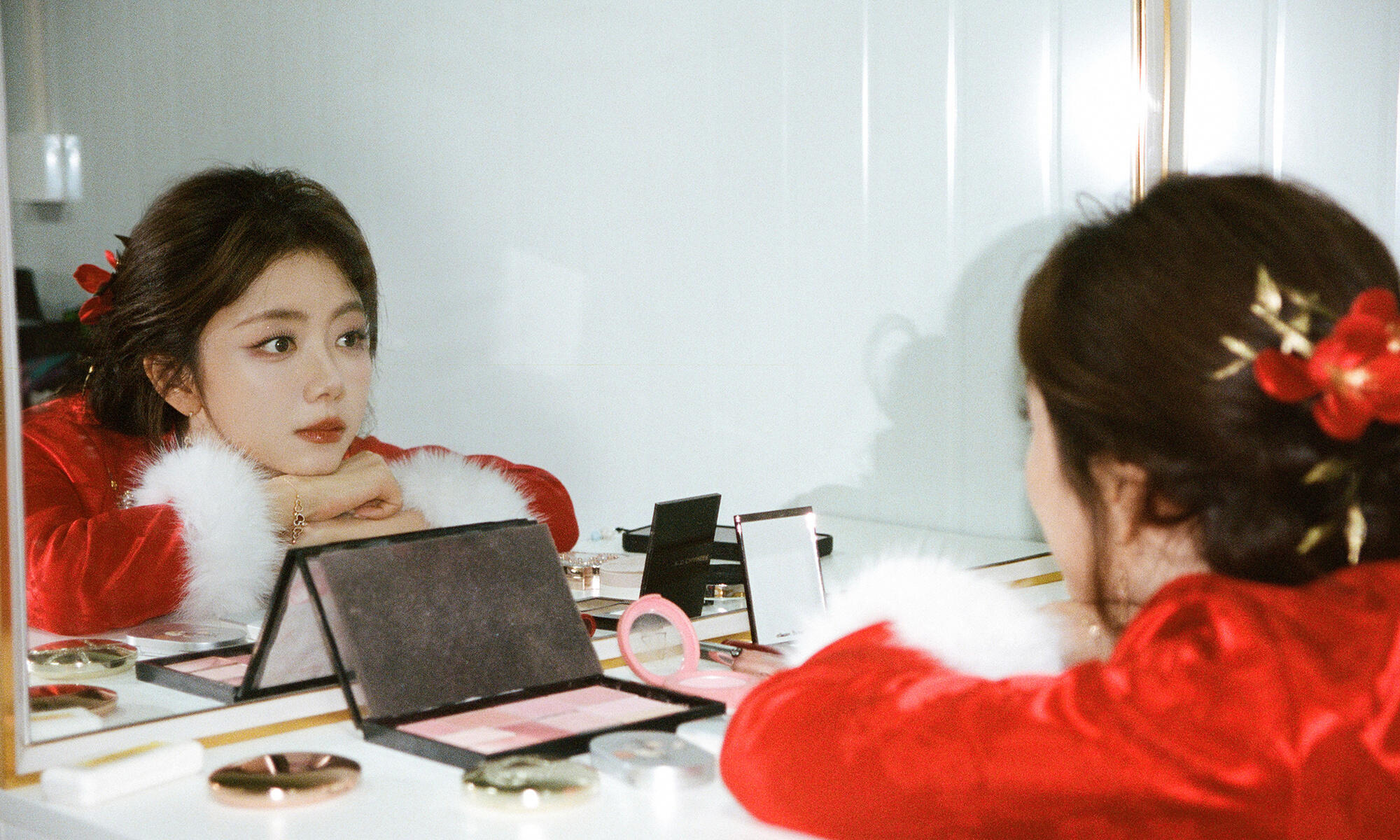 春晚新春茶话会好好过大年谭松韵JUN BY YANGJUN「韶韵花绮」定制套装,正红提花缀牡丹,毛领添娇俏,春晚舞台尽显东方雍容与灵动气韵。
