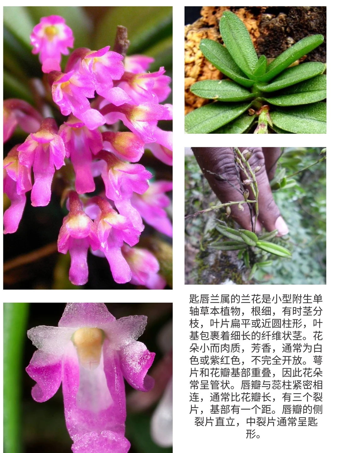匙唇兰属的兰花是小型附生单轴草本植物,根细,有时茎分枝,叶片扁平或近圆柱形,叶基包裹着细长的纤维状茎。花朵小而肉质,芳香,通常为白色或紫红色,不完全开放。萼片和花瓣基部重叠,因此花朵常呈管状。唇瓣与蕊柱紧密相连,通常比花瓣长,有三个裂片,基部有一个距。唇瓣的侧裂片直立,中裂片通常呈匙形。