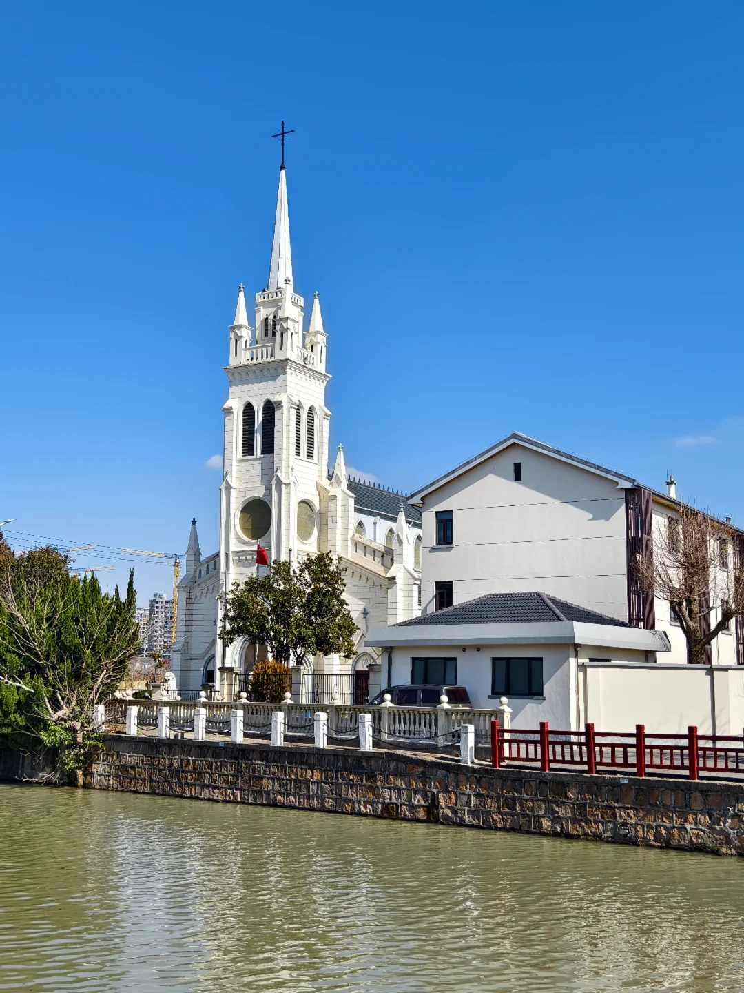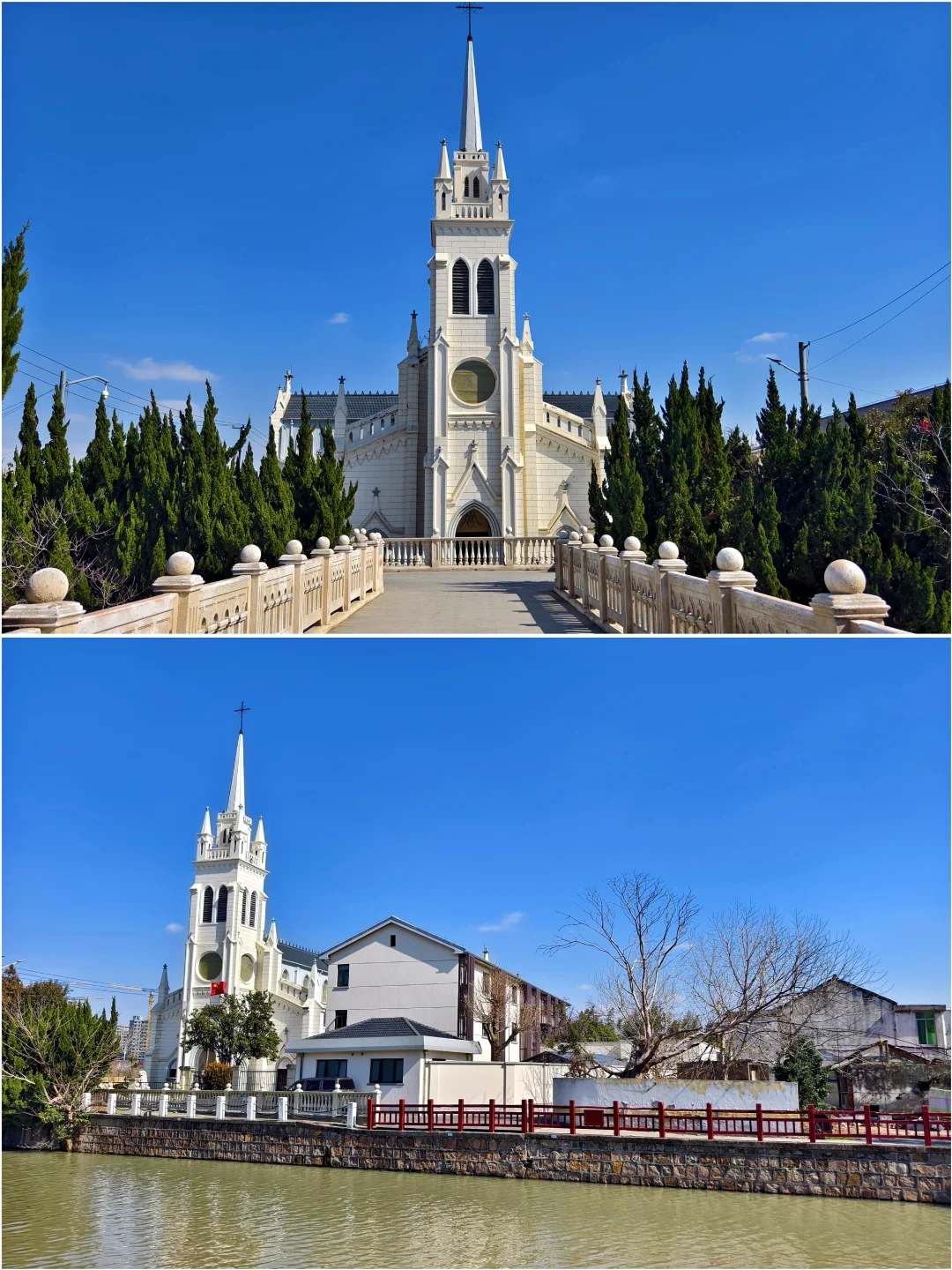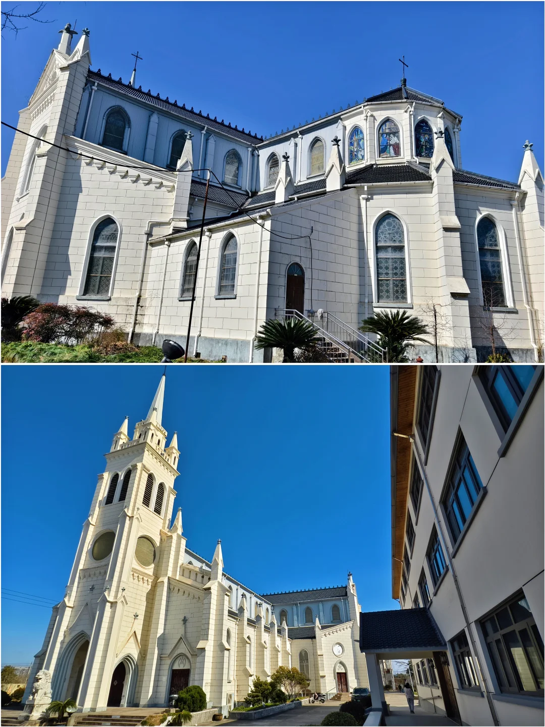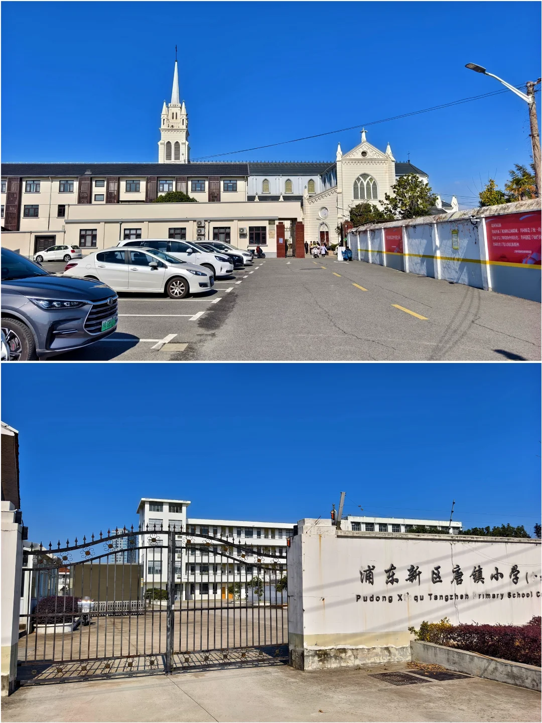 🔥天主教上海教区唐墓桥露德圣母堂,位于浦东新区唐镇老街40号,教堂于1895年动工,1898年初竣工。有段时间,教堂先后被用作农机厂和铸钢厂厂房,1992年修复并重新开放。 🔥仿照法国露德圣母大殿式样建造,宏伟的哥特式风格:教堂整体呈拉丁十字形,最引人注目的是它高达47.4米的钟楼,是晚清浦东最高建筑之一。你可以沿着螺旋扶梯登上钟楼,东望大海,西眺市区。 🔥小时候就读的唐镇小学,就在边上。