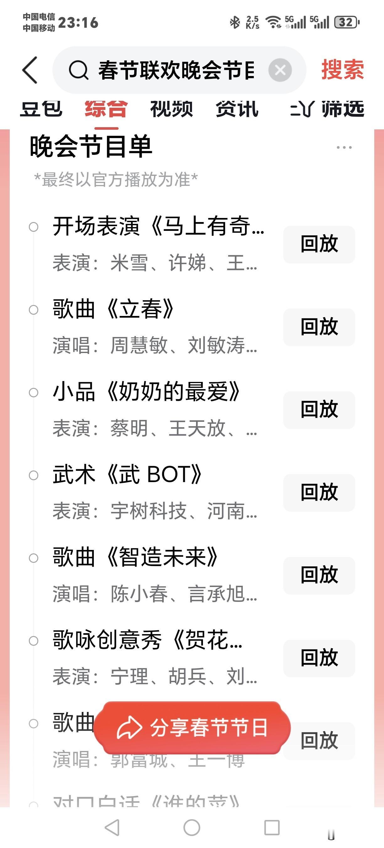 今年的春晚手机上可以看回放,真是新奇! 刚刚打开头条,发现有个节目单,已经播放过了的节目单后面有个回放按钮,点开可以重新播放。如果有朋友没有看节目,或者需要回看,真是方便。这在历届春晚节目播出中还是第一次。 不知道大家发现了没有?春晚时间安排 往年春晚 春晚节目设置 再回顾一下春晚